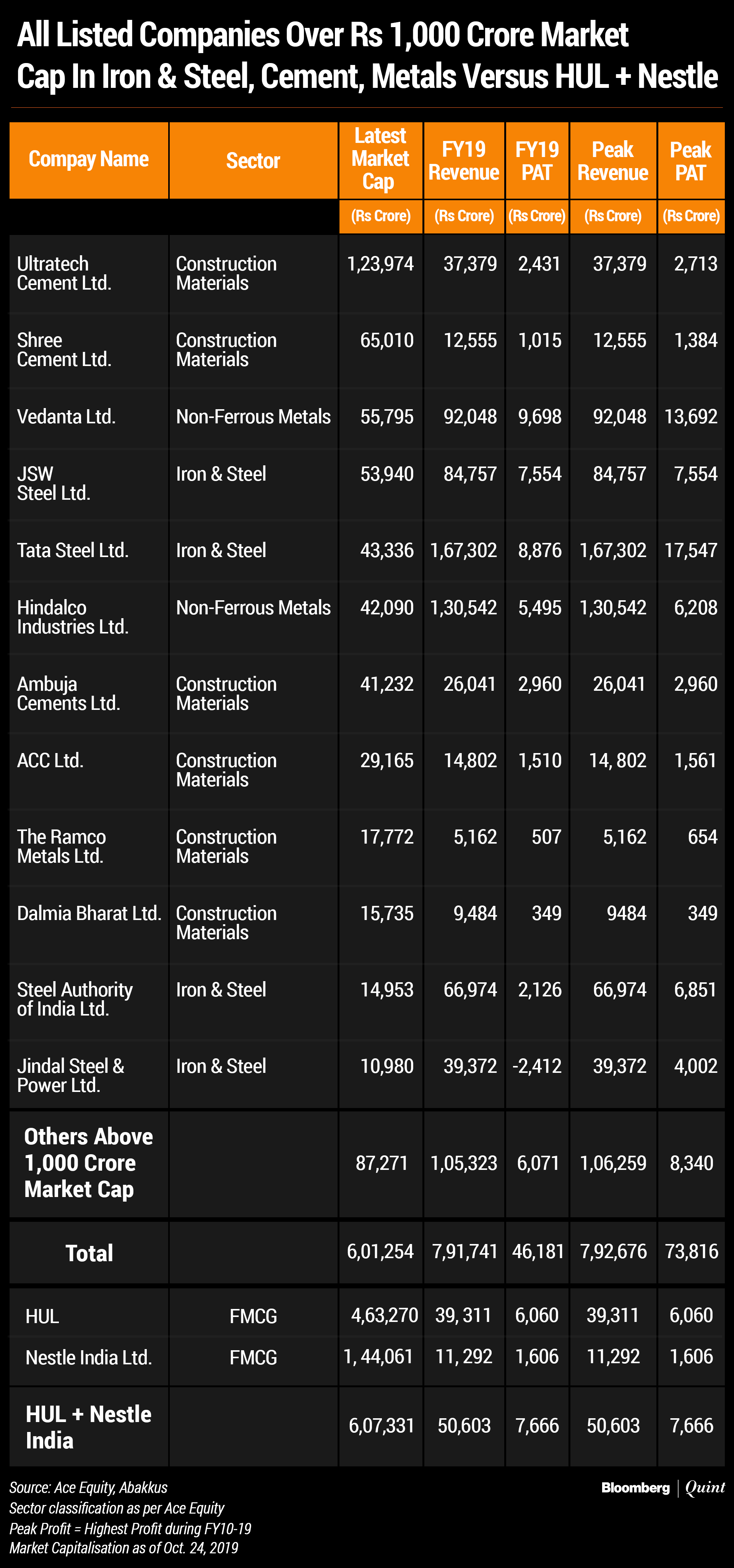 As can be seen from the table below, the total market cap of Hindustan Unilever and Nestle India is more than the market cap of all listed Indian companies in the following sectors: iron and steel, construction materials (includes cement), non-ferrous metals and ferrous metals (classification as per Ace Equity). The peak profits in the last 9 years that these companies made is around Rs 73,000 crore, almost 10x that of Hindustan Lever and Nestle India put together.