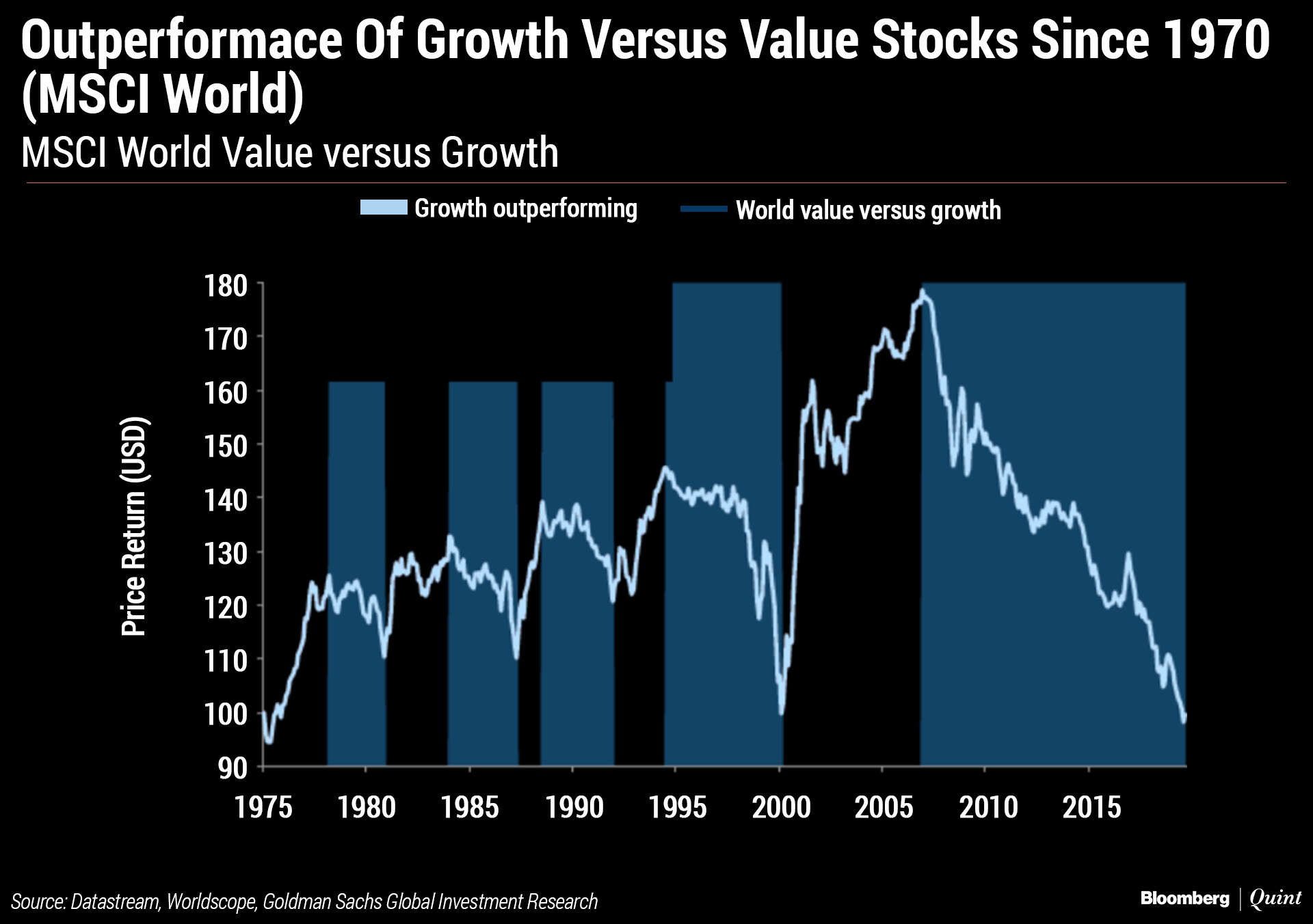 Similarly, globally, the outperformance of Growth versus Value Stocks has had the strongest and longest run in the last 10 years or so since 1970 (MSCI World).