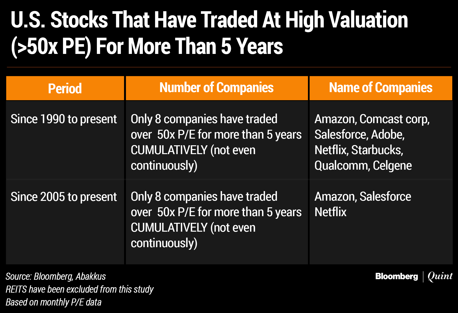 There have hardly been companies in the global markets which have traded at multiples of 50-75x for periods of 10-15 years. In fact, we found that very few companies in the U.S. have traded at P/E over 50x for even five years cumulatively since 1990 even though this period included ‘dot-com bubble' and ‘subprime crisis'.
