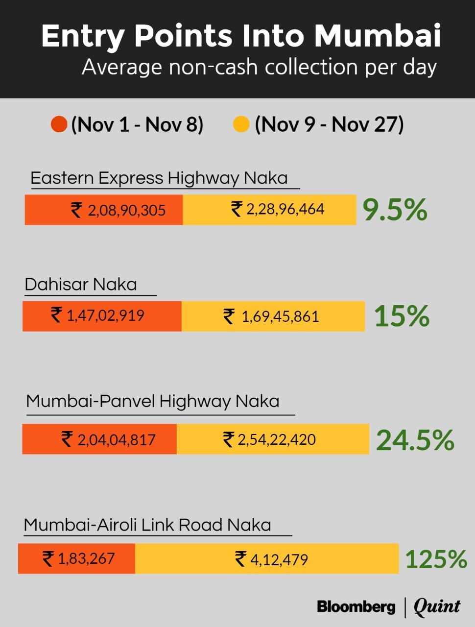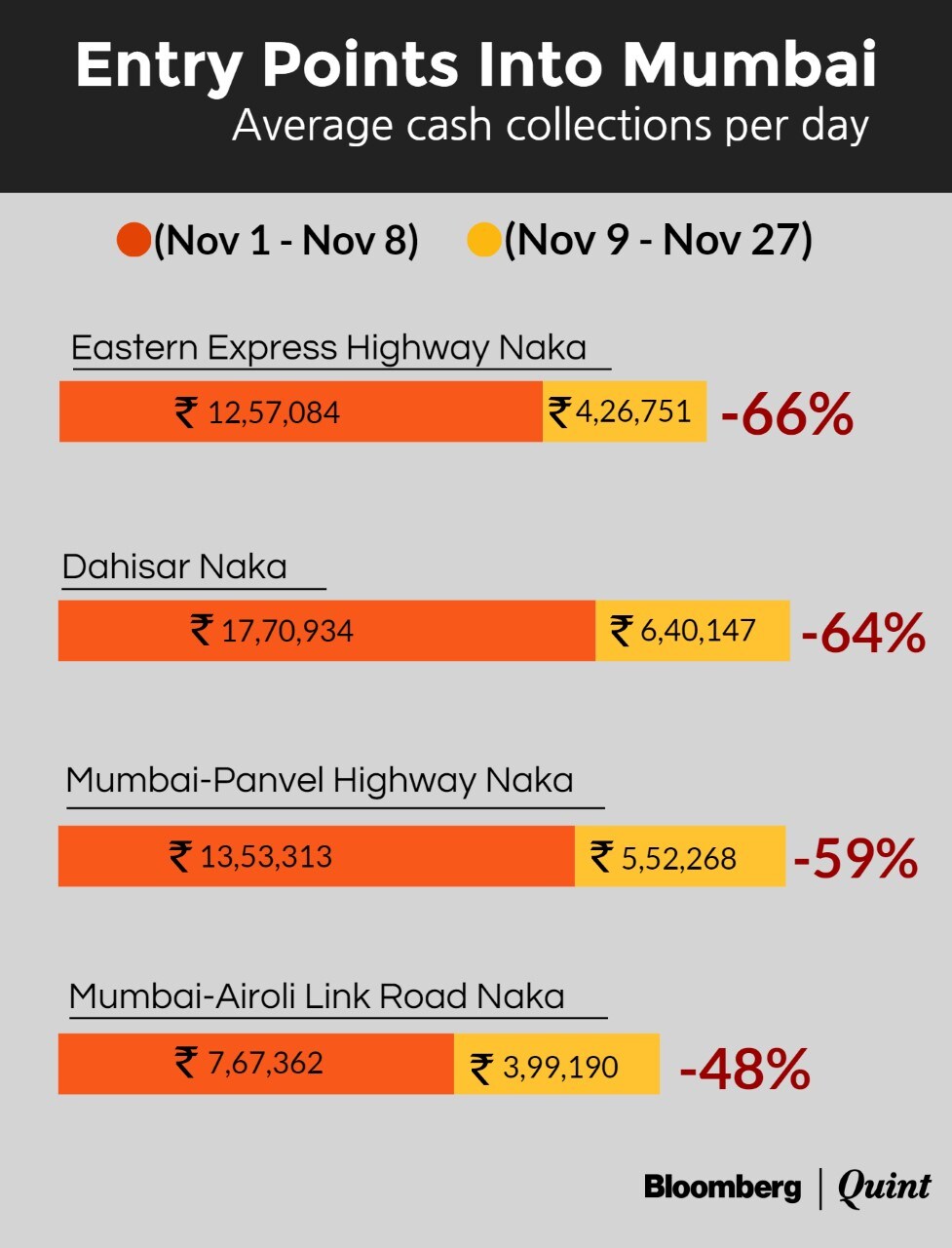 There are 37 entry points into Mumbai, and the data collected by BloombergQuint from the four most important toll nakas in the city, shows that there has been a 60 percent drop in cash payments, while other modes of payment have jumped 10-15 percent.