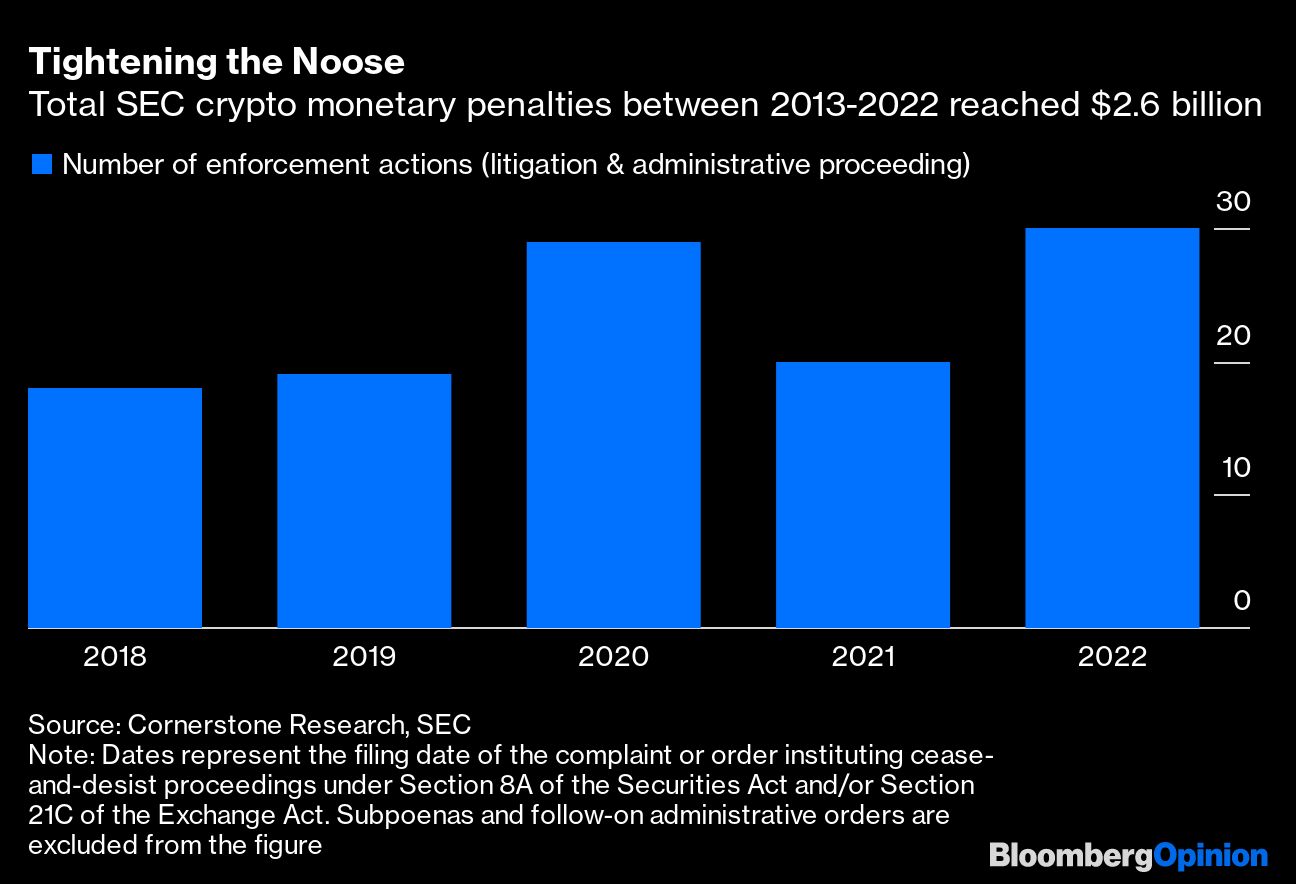 But this ignores the bigger picture. In the first few weeks of 2023, watchdogs have done a lot. On Jan. 3, a joint statement by US bank regulators warned the industry of crypto risks creeping into the banking system. Then came a $100 million settlement with Coinbase Global Inc. over weak internal controls, a lawsuit against the Winklevoss twins' Gemini and broker Genesis for allegedly selling unregistered securities, and a $45 million settlement with lending platform Nexo (which has ceased US operations). Subpoenas are flying.