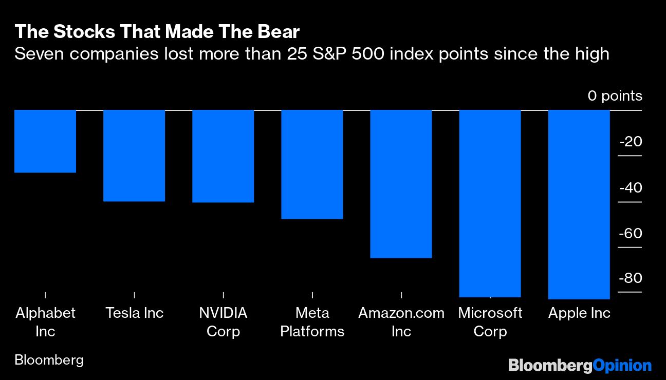 Yes, there is also now an “official” bear market in the US for those who hold that an index needs to drop 20% before such an event can be declared. This was a top-down selloff if ever there was one, and nothing matters more to the stock market in the near term than the decisions of a few central bankers. But to give a little anatomy to this bear, it's interesting to see where the pain has been felt most. Seven large companies jointly account for 42.5% of the index points the S&P 500 has lost since its peak in January:
