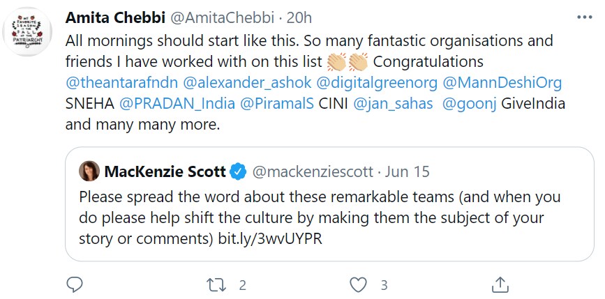 The pandemic exposed the public health faultlines in the country drawing the attention of the global philanthropic ecosystem to India's developmental needs, said Atul Satija, chief executive of GiveIndia and founder of The/Nudge Foundation. Both feature on Scott's list and the money is already in the bank. It took just 2 weeks versus the 3-6 months such grants usually take.