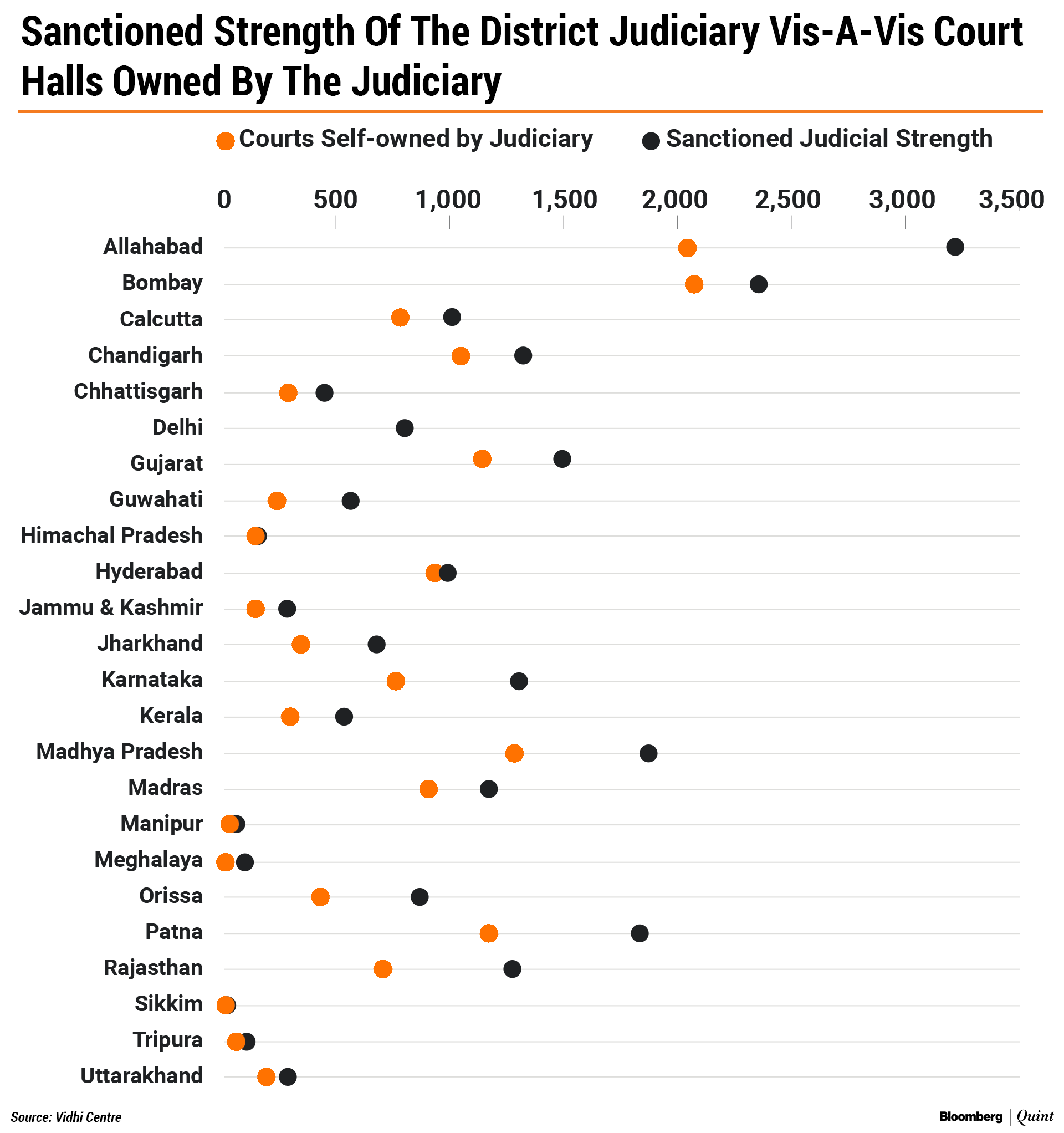 It is often suggested that the judiciary in India is unable to clear the backlog of cases because of a lack of judges, especially at the level of the district judiciary which is the first point of contact for most litigants in India. One of the reasons for judicial vacancies at the district level is the lack of courtrooms to seat judges. Against the sanctioned strength of 22,750 judges for the lower judiciary, the judiciary owns only 15,042 courtrooms (as per figures provided by the Department of Justice). Another 3,402 courtrooms function out of rented buildings and are subject to the lessor's whims. The shortage is, therefore, at 7,708 courtrooms, presuming we do not want judges functioning out of rented premises. Creating physical infrastructure is fundamental to decreasing backlogs.