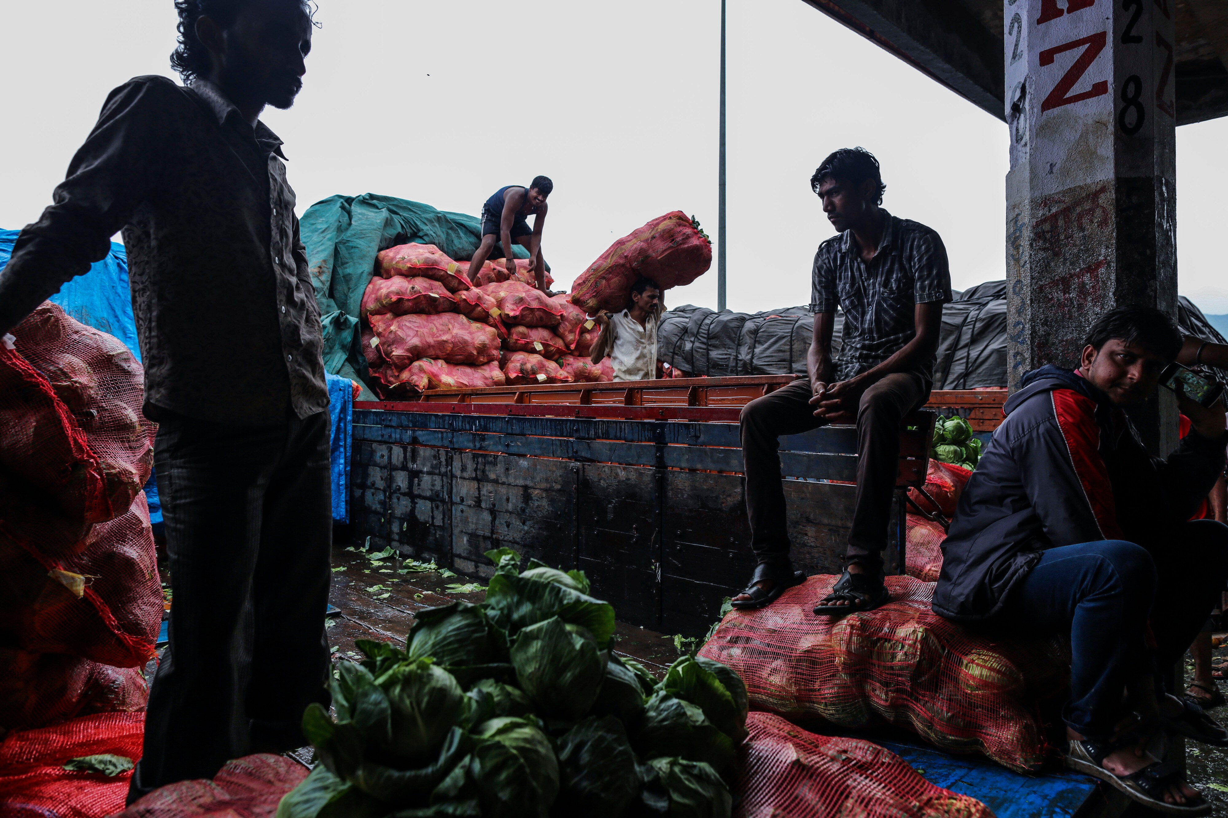 Workers offload sacks of cabbages from a truck at the Vashi APMC wholesale market outside Mumbai. (Photographer: Dhiraj Singh/Bloomberg)