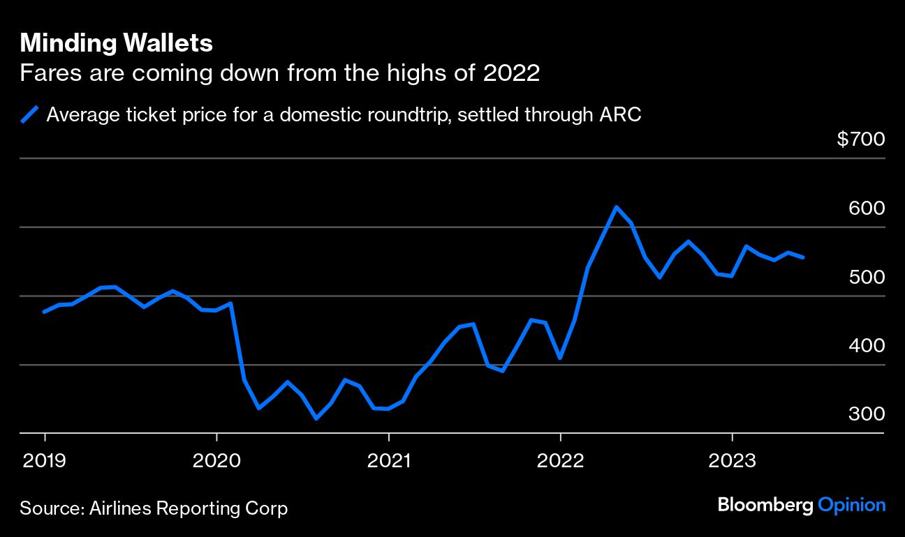 The average price in June for a US round-trip ticket booked through travel agencies was $555, down about 8% from the period a year earlier, according to data from Airlines Reporting Corp. That's the third consecutive month that fares have declined relative to 2022 levels. Fares are still about 8% above 2019 levels, and continued system constraints provide some kind of floor on pricing.