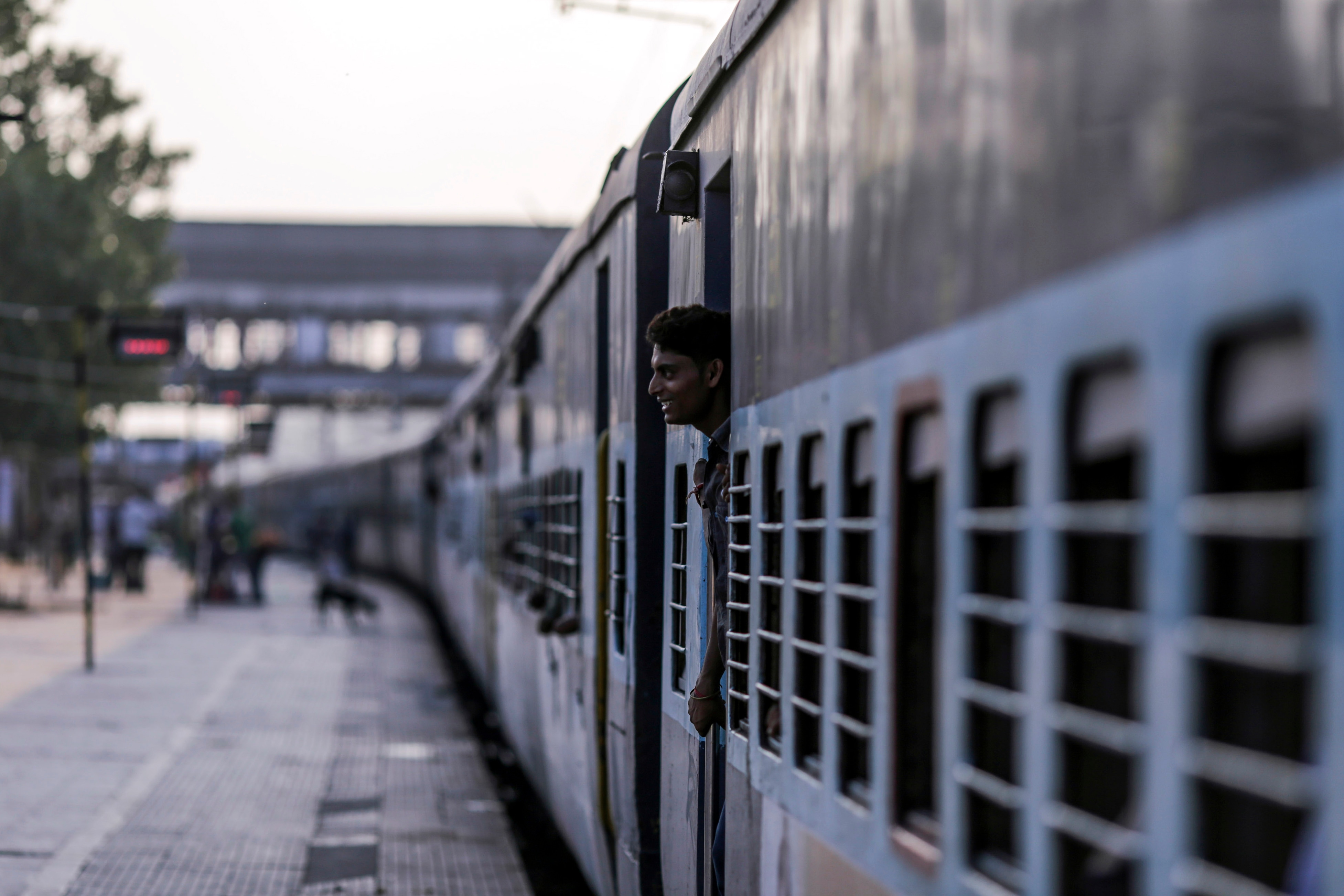 A passenger stands in a carriage doorway on the Kalka Mail train as it stands at Mughalsarai Junction (Photographer: Dhiraj Singh/Bloomberg)