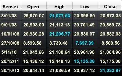 The Sensex hit the 21,000 mark for the first time on January 8, 2008. A couple of sessions later on January 10, the BSE benchmark of 30 shares hit a high of 21,206, a record that stayed until Friday.