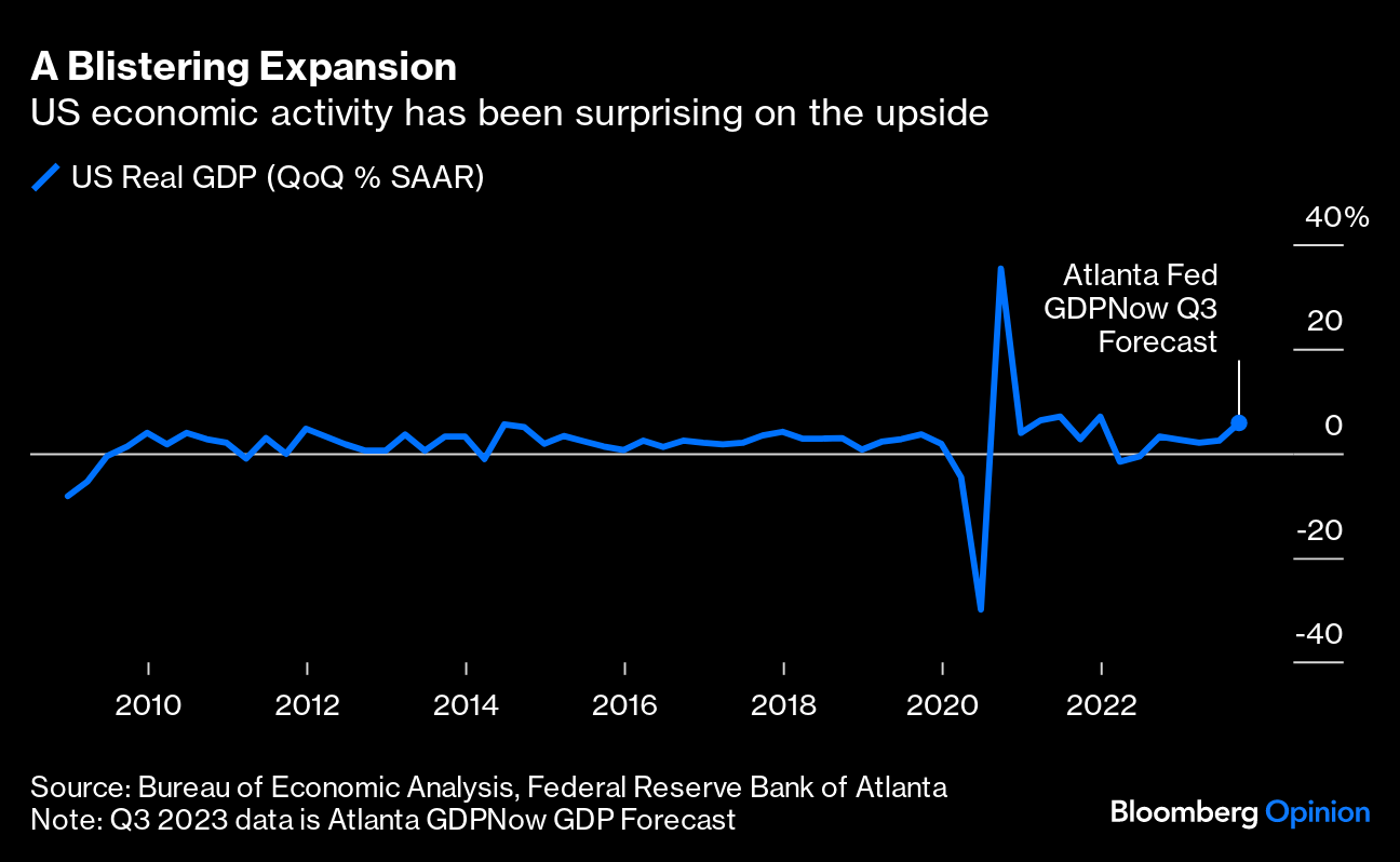 (Bloomberg Opinion) -- Halfway through the third quarter, the economy is looking surprisingly strong. A tracker from the Atlanta branch of the Federal Reserve has real gross domestic product growth, based on the limited data we've gotten so far, tracking at 5.8%, which would be the fastest for a non-pandemic quarter in 20 years. If the US keeps up this blistering pace, it would trump economists' forecasts for every other major economy except India.It wouldn't be a shock, of course, if growth ultimately comes in lower than that, but it's pretty clear at this stage that the third quarter really does look strong. How long can that be sustained? It's likely that some of the factors boosting economic activity at the moment will abate by the beginning of 2024, but we should be left with an economy still growing at a reasonable pace.