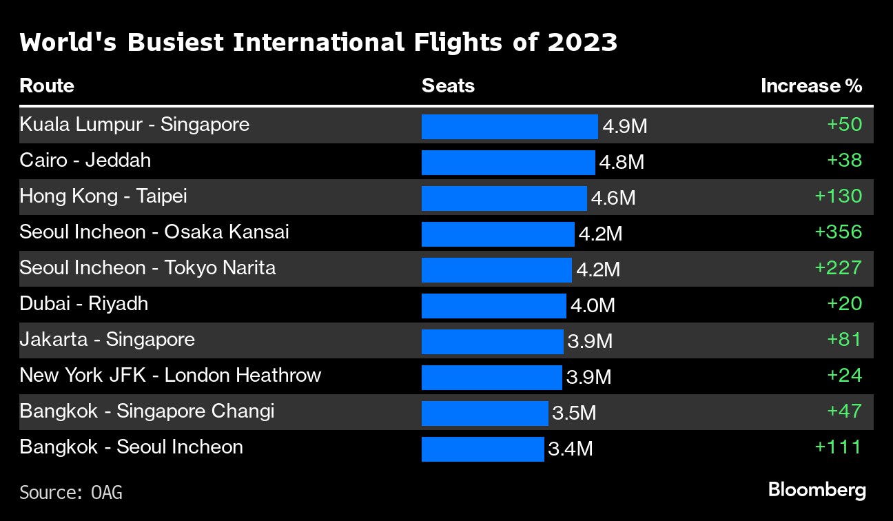 (Bloomberg) -- The one-hour flight between Singapore and Kuala Lumpur in Malaysia was the world's busiest international route this year, underscoring the scale of Asia's travel rebound in the wake of Covid-19.