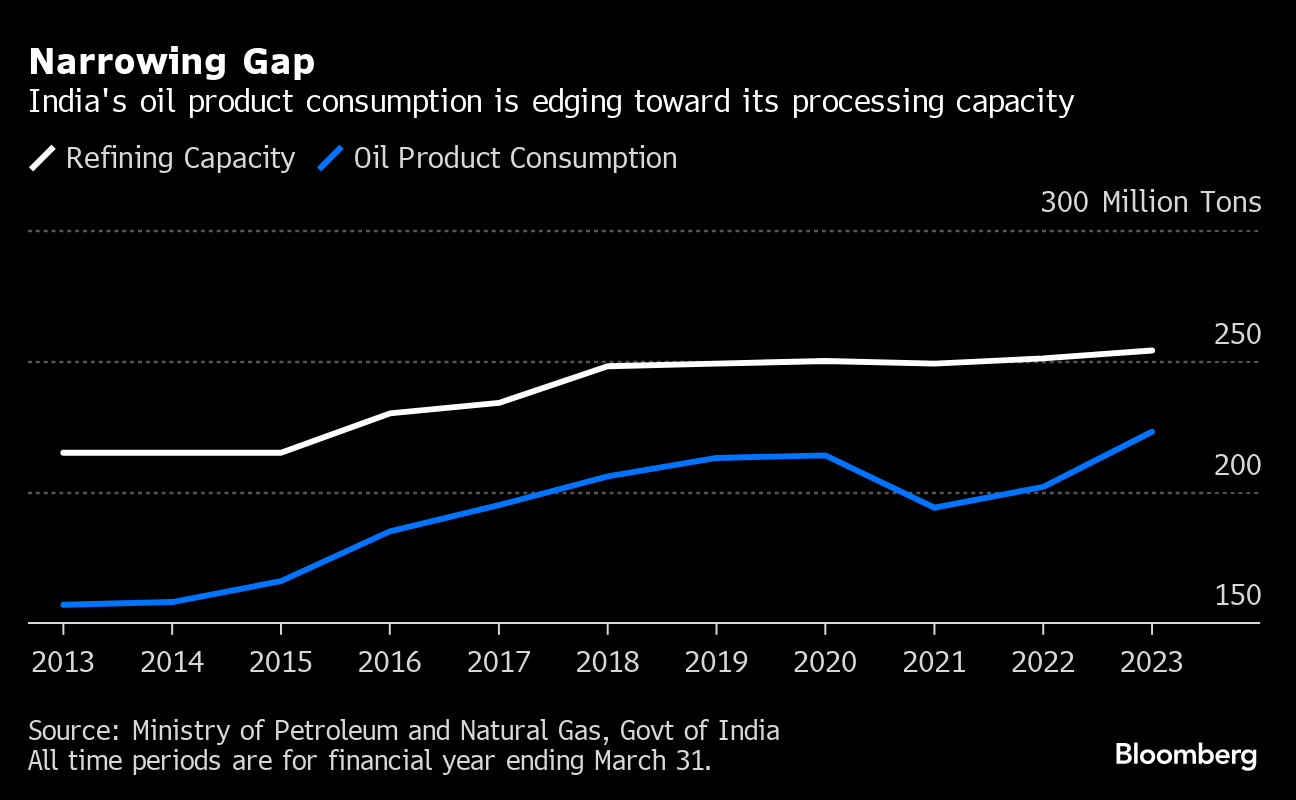India's planned additions include petrochemical complexes, but most of the capacity will be for transport fuels. The nation's overall refining capacity was almost 254 million tons as of April 1, 2023, according to government data.