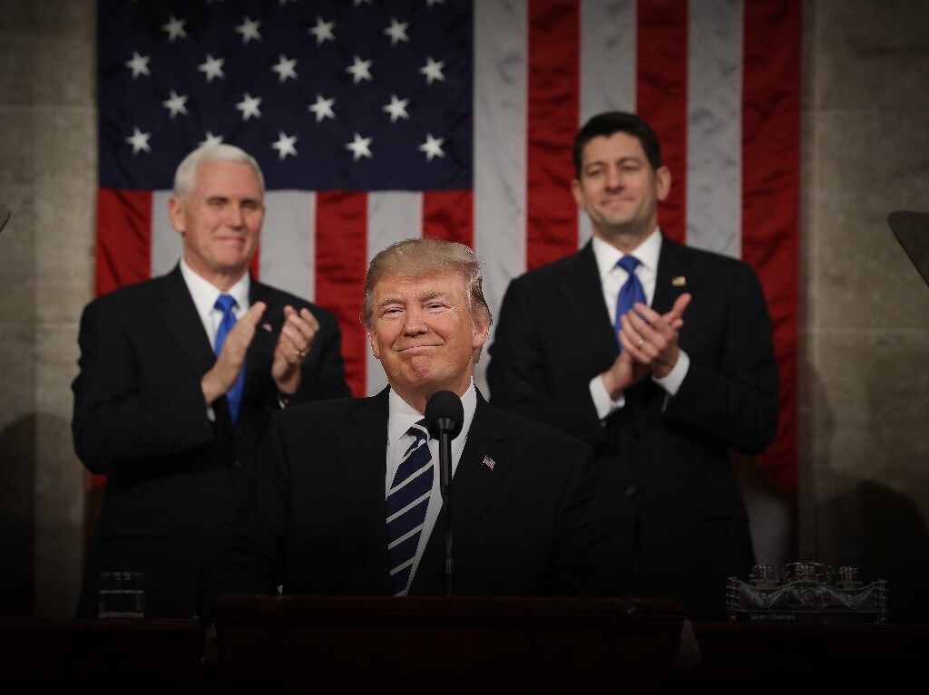 U.S. President Donald Trump smiles as Vice President Mike Pence and House Speaker Paul Ryan applaud during a joint session of Congress in Washington, D.C., on February 28, 2017. (Photographer: Jim Lo Scalzo/Pool via Bloomberg)