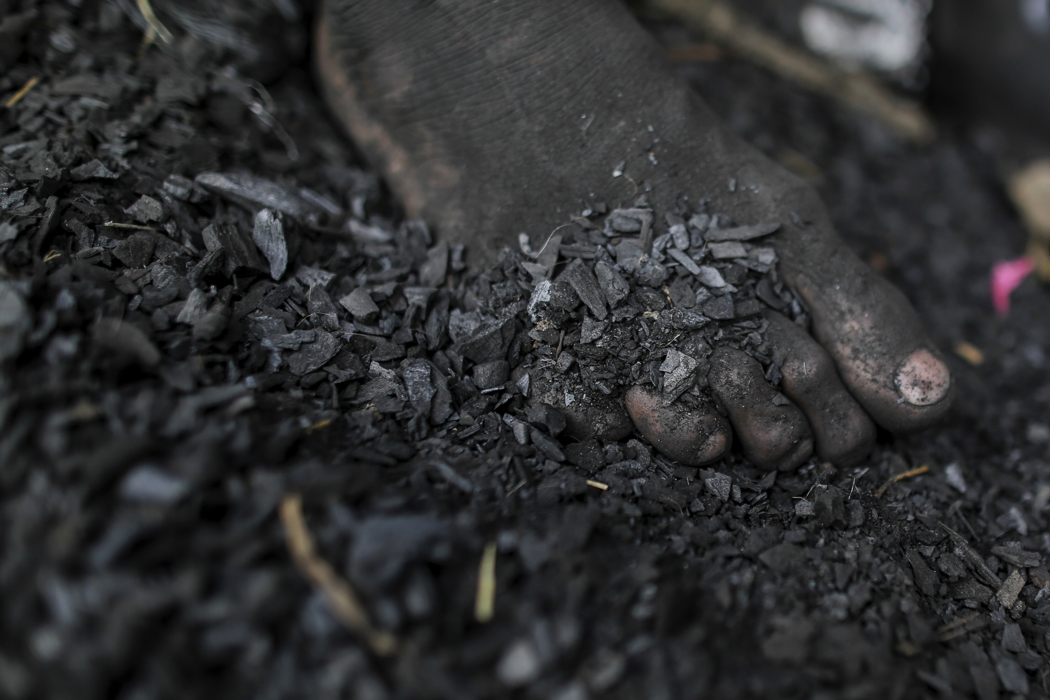 A worker’s foot is covered in coal dust at a coal wholesale market in Mumbai (Photographer: Dhiraj Singh/Bloomberg)