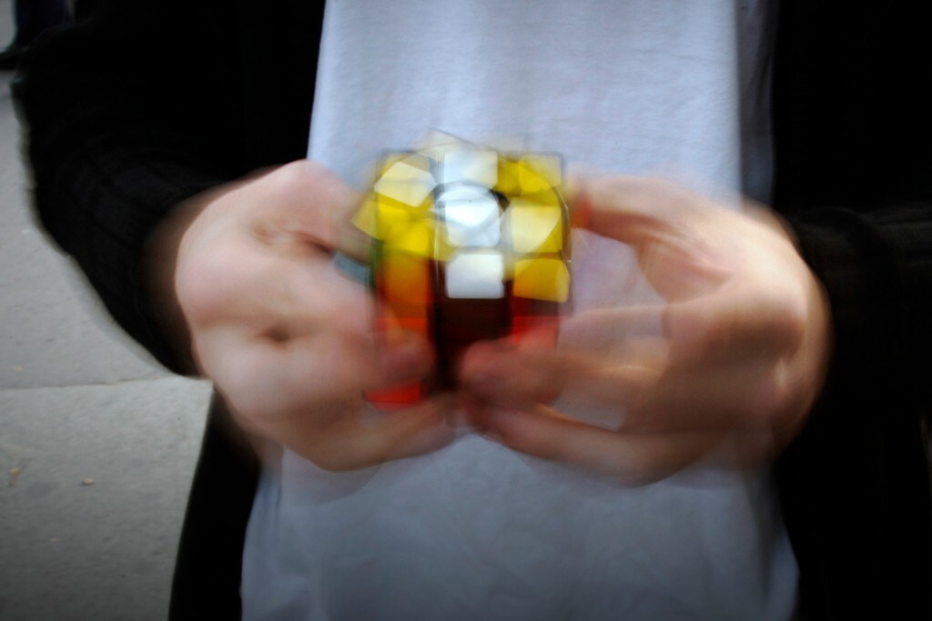 A one-time Rubik’s Cube world champion is pictured solving the puzzle. (Photograph: Mark H. Milstein/Bloomberg)