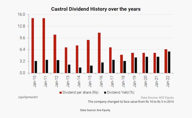 Castrol currently trades at a price to earnings (PE) multiple of 13.4 times and a price to book value (P/BV) multiple of 5.8 times. Castrol's five-year median PE stands at 28.4 and five year median P/BV is 17.3x.