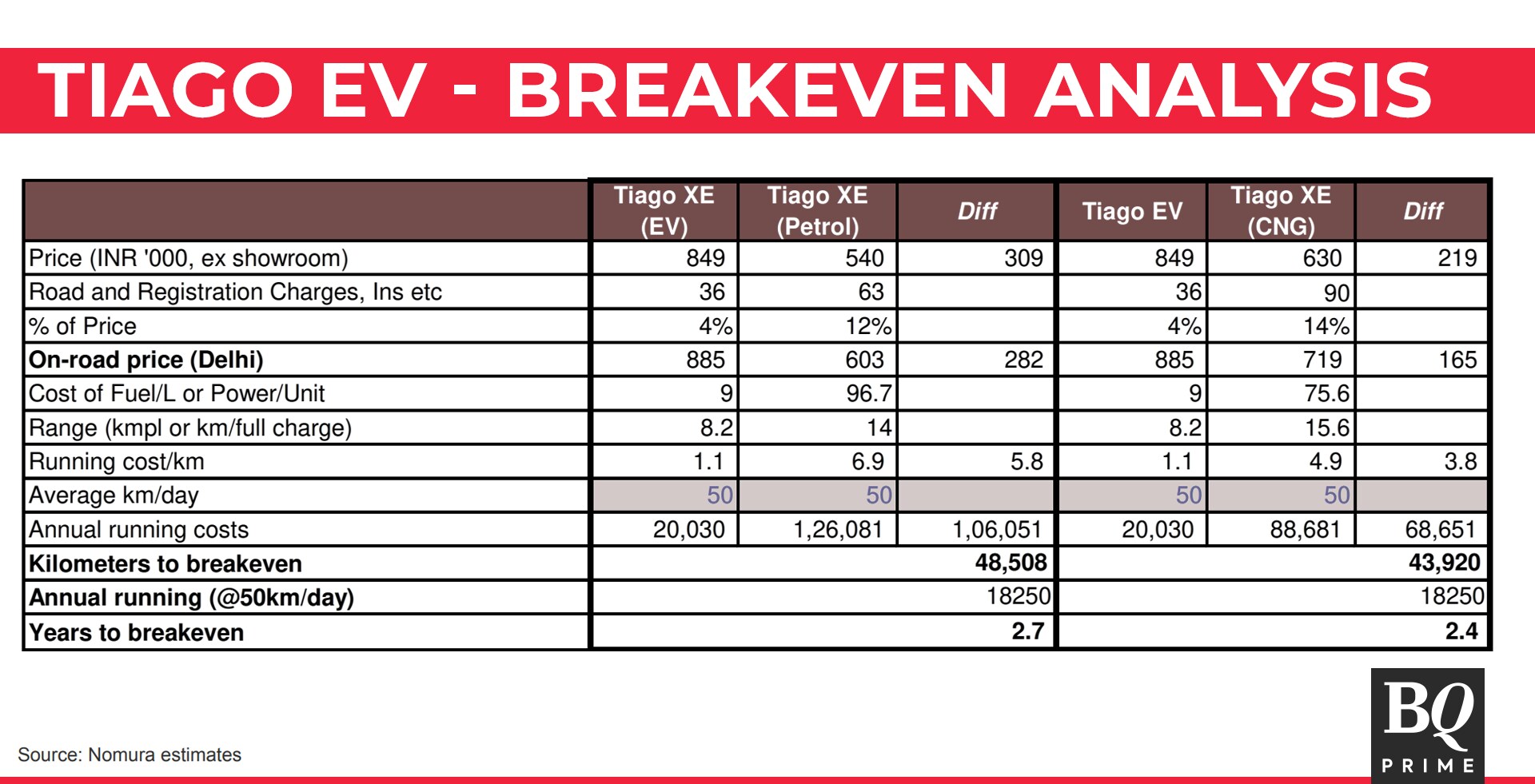 According to Nomura's calculations, the running cost of a Tiago EV is Rs 1.1/km or one-sixth of Tiago XE's Rs 6.9/km. The price gap between the two variants is Rs 2.82 lakh (on-road price, Delhi), which will be recovered in 2.7 years if a customer drives 50/km a day. In less than 50,000 km, a Tiago EV owner would've recovered the premium paid for the car.