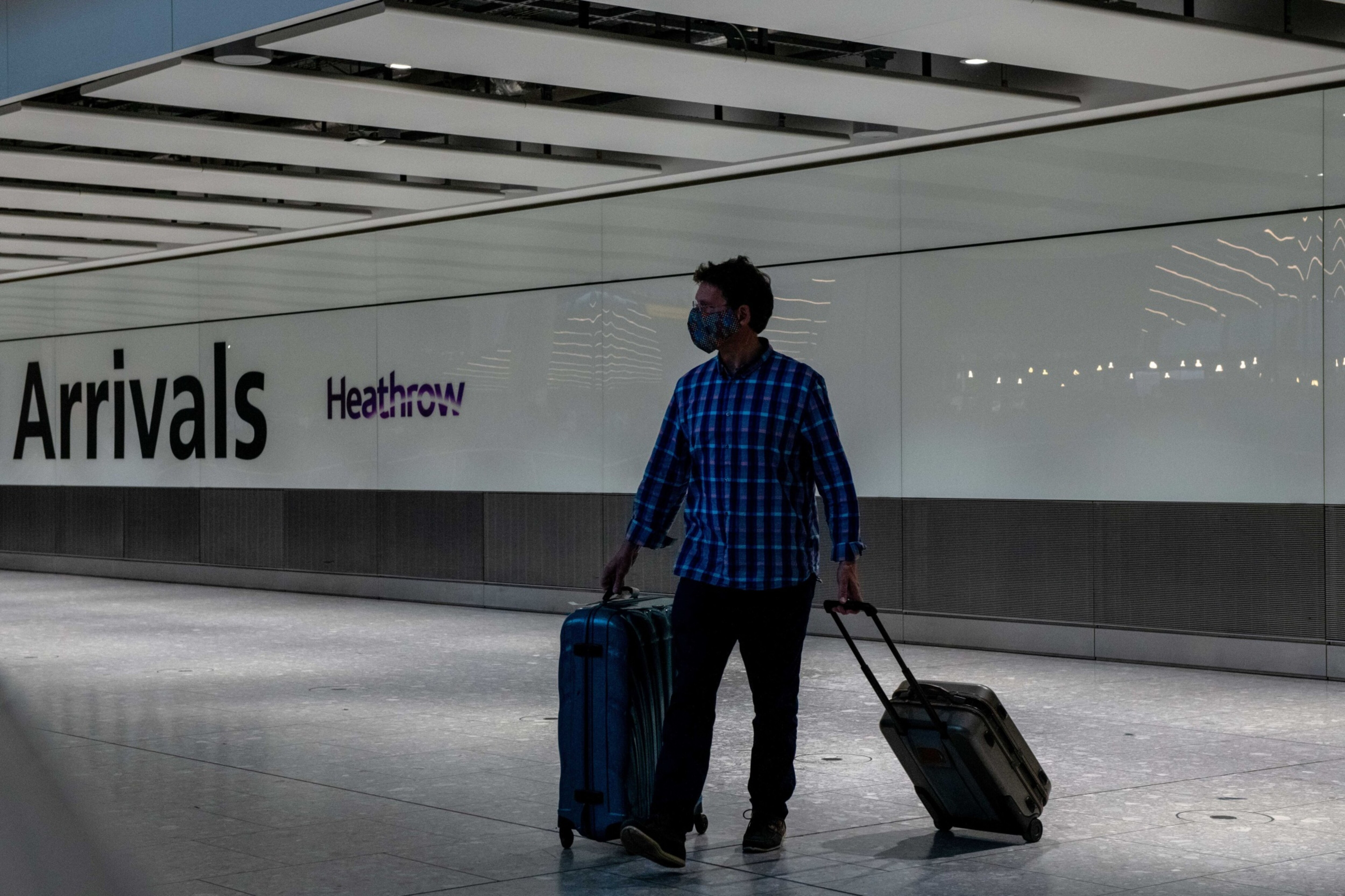 A traveler passes a sign for a Covid-19 testing centre at London Heathrow Airport, on Jan. 18, 2021. (Photographer: Simon Dawson/Bloomberg)