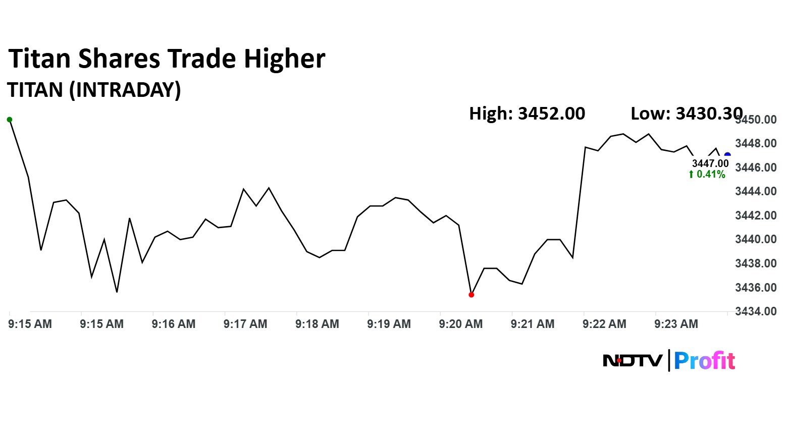 Shares of Titan rose as much as 0.55% to Rs 3,452 apiece. They pared gains to trade 0.41% higher at Rs 3,447 apiece, as of 9:25 a.m. This compares to a 0.19 % advance in the NSE Nifty 50.