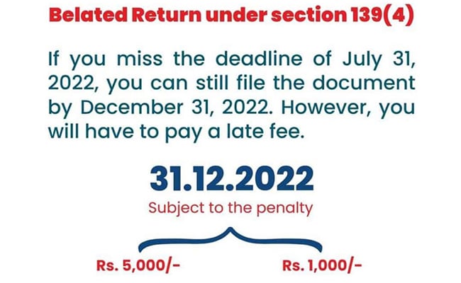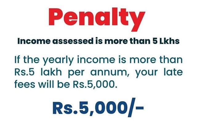 For taxpayers with a yearly income up to Rs 5 lakh, there is a Rs 1,000 late fine. The late fee is Rs 5,000 if your yearly income exceeds Rs 5 lakh.