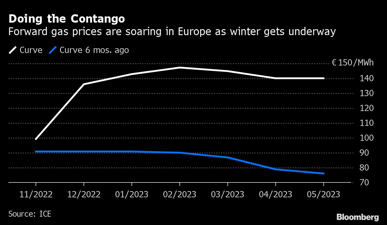 Gas is near the lowest since June, though the dangers are still in the market pricing. February futures are trading at a 44% premium to November, and costs for next winter are also higher, showing that supply issues are expected to persist.