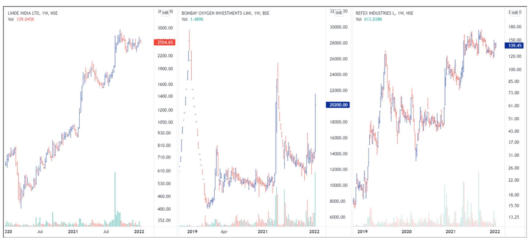 Technically, most of the Oxygen stocks like Linde India, Bombay Oxygen and Refex Industries are on the verge of consolidation breakout. An increase in volumes indicates the liking for these stocks by traders and investors.