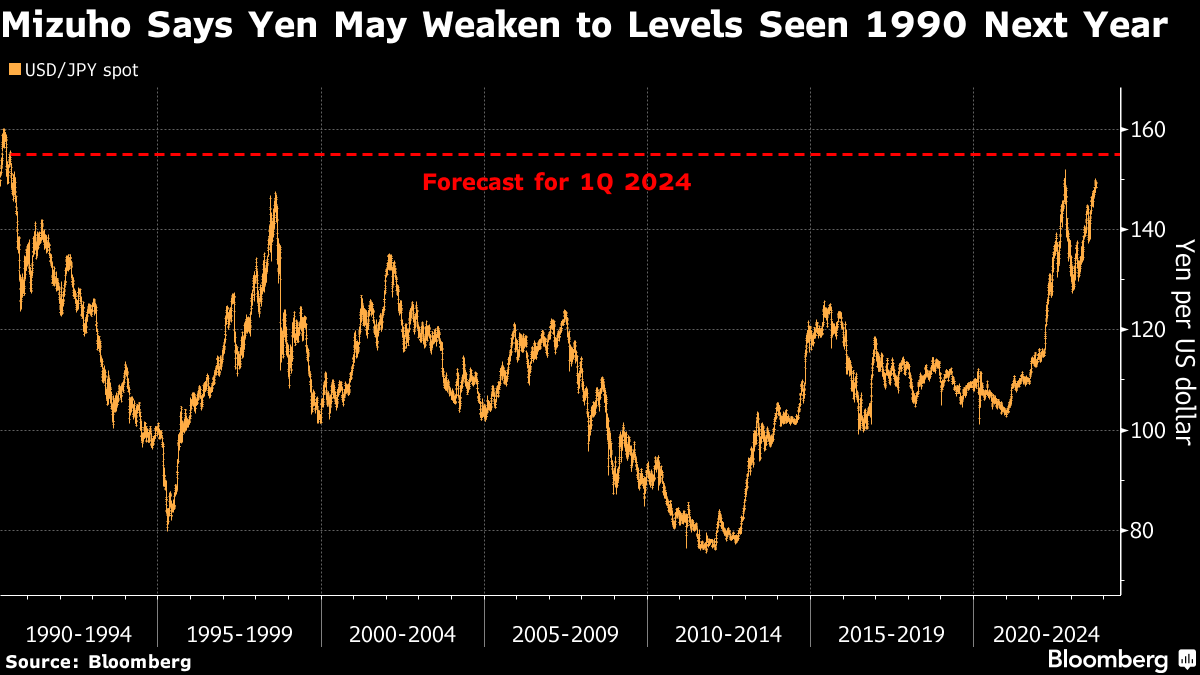 Mizuho isn't alone with that call: Goldman Sachs Group Inc. strategists in August said the yen would slip to 155 early next year as local policymakers stay dovish. Bank of America Securities also expects the yen to bottom out at 155 in the first part of 2024.