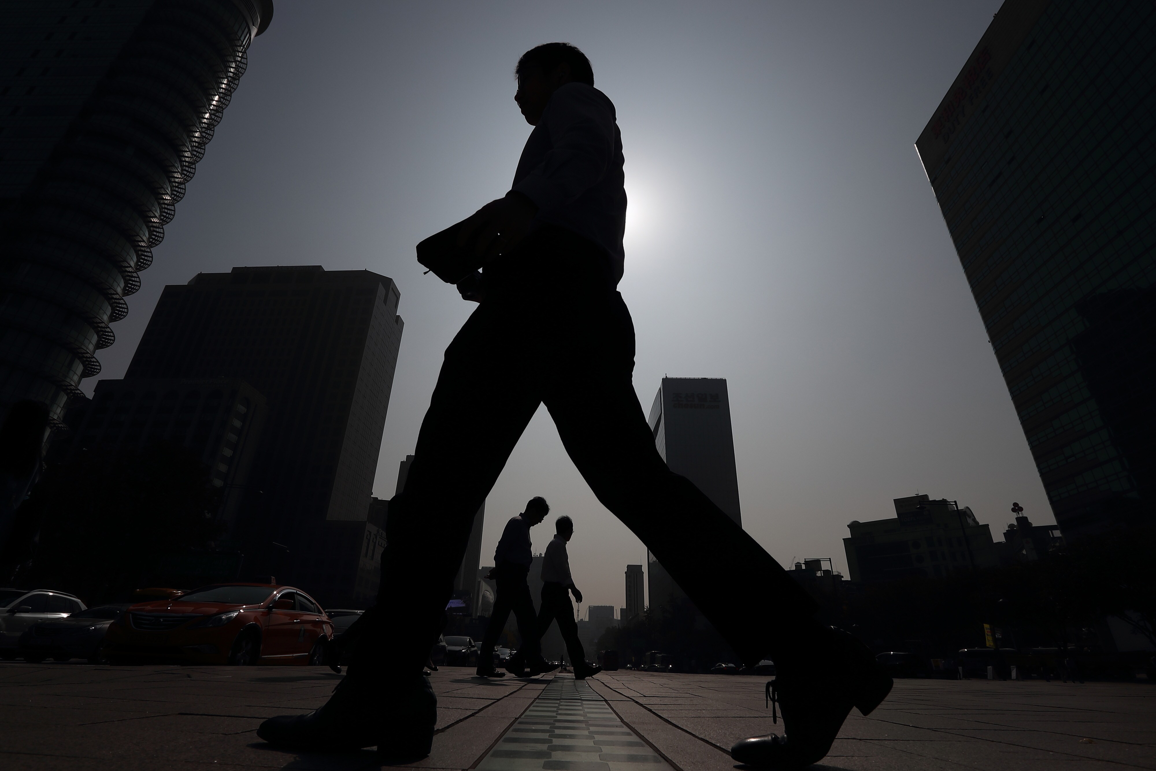 Pedestrians are silhouetted against the sun as they cross a road in Seoul, South Korea. (Photographer: SeongJoon Cho/Bloomberg)