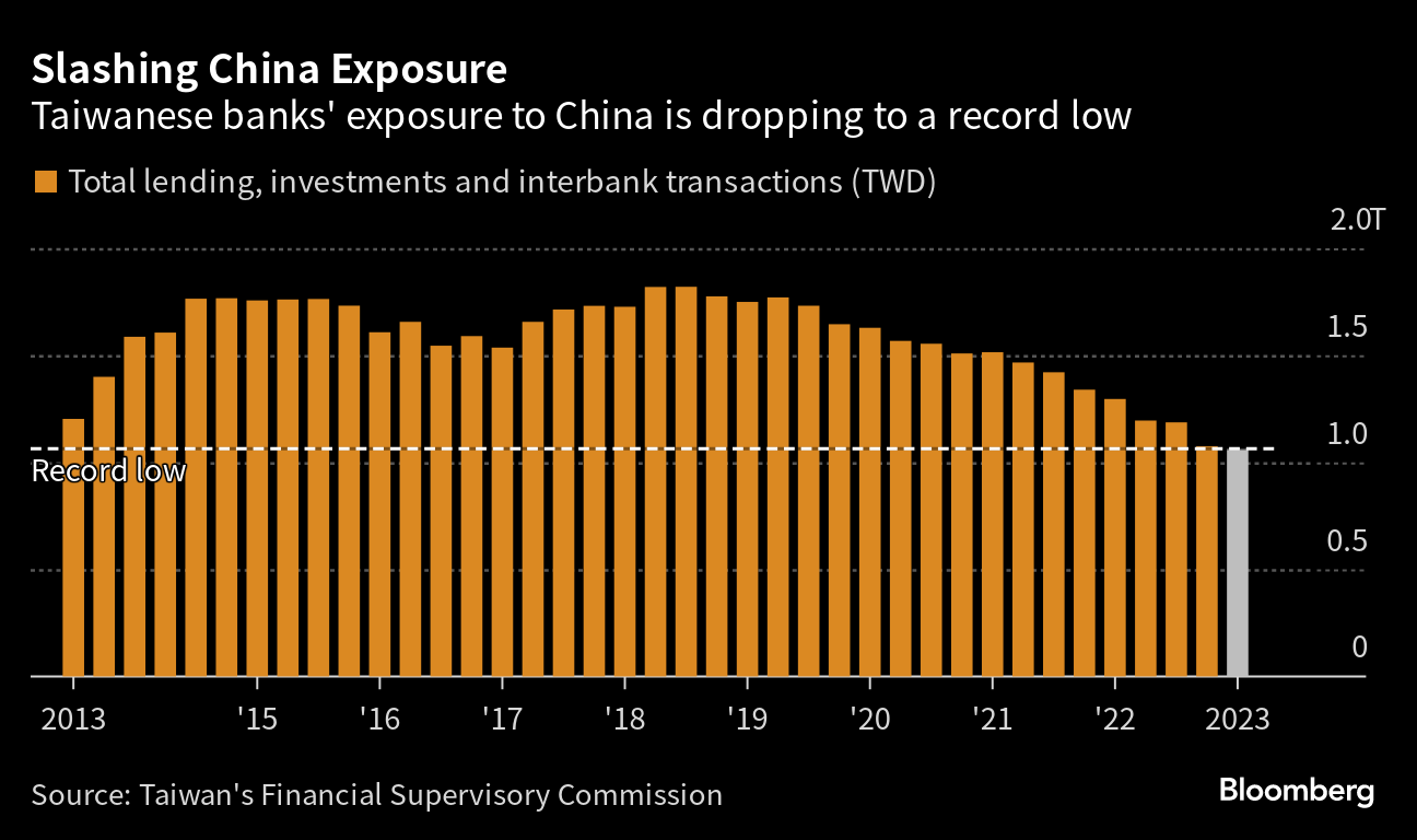 Cathay's moves are in tandem with a measurable shift away from China by Taiwanese banks, which have slashed their exposure to the world's second largest economy to the lowest level in at least a decade. Total lending, investments and interbank transactions in China by Taiwanese banks fell 18% in the first quarter of 2023.