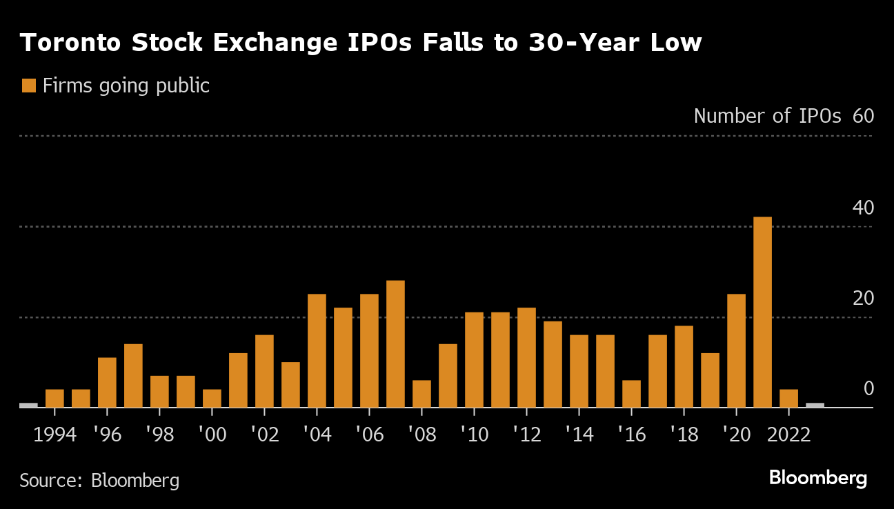 (Bloomberg) -- Canada's largest stock exchange is in the midst of a historic dry spell for initial public offerings and it's unlikely to improve anytime soon.