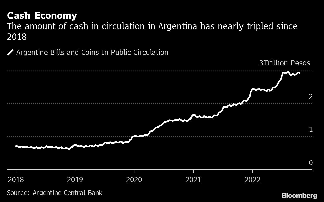 (Bloomberg) -- Paying for cash is becoming increasingly cumbersome in Argentina, with huge piles needed as the government refuses to issue bills with larger denomination despite inflation galloping toward 100%.