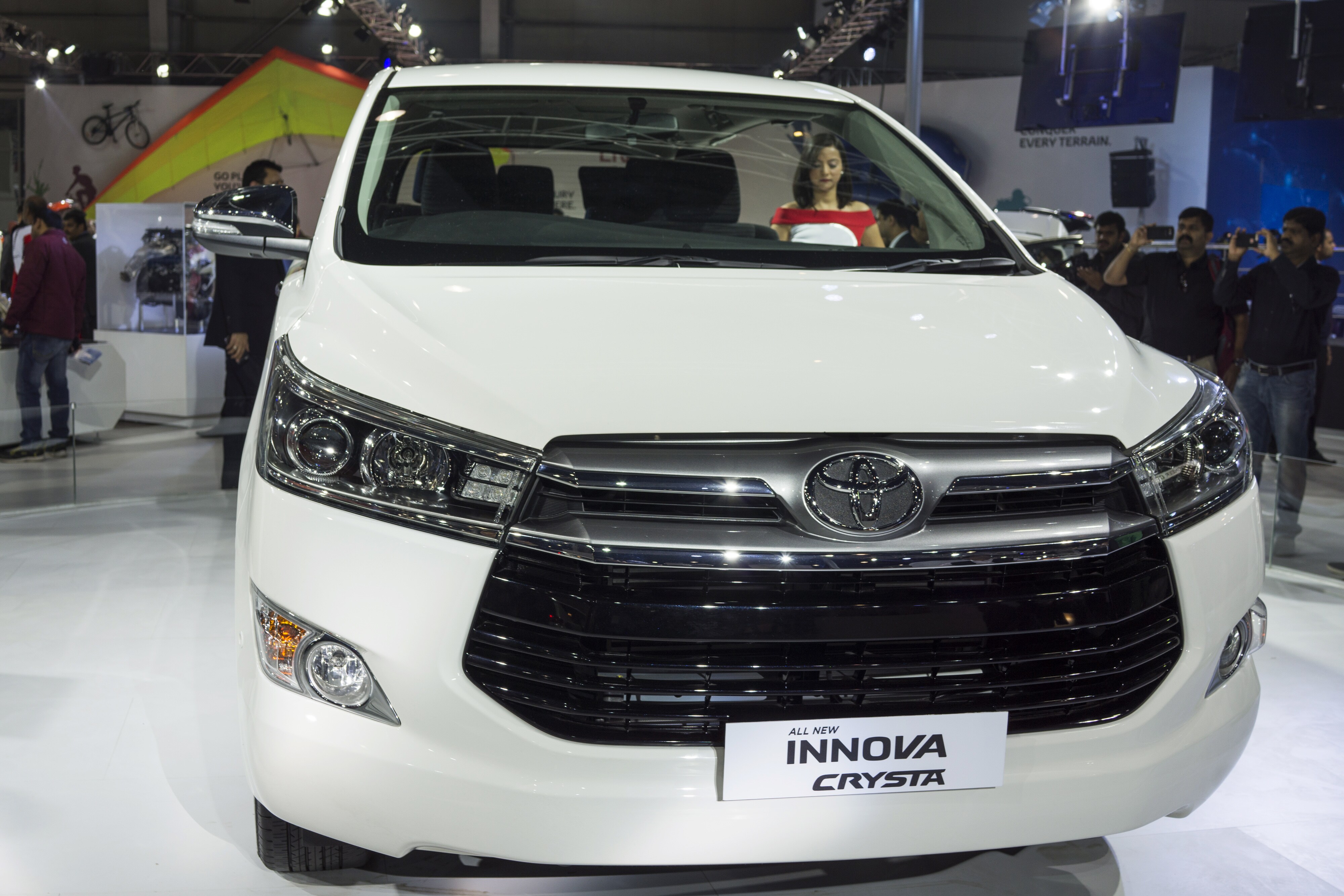 A Toyota Motor Corp. Innova Crysta multi purpose vehicle (MPV) sits on display at the Auto Expo 2016 in Noida, Uttar Pradesh, India. (Photographer: Prashanth Vishwanathan/Bloomberg)