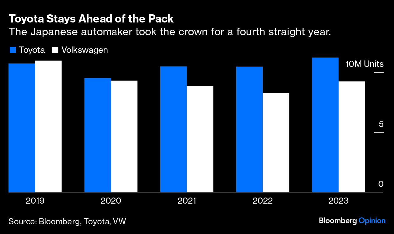 What's more, the long-term blueprint for new-energy vehicles is missing. To date, Toyota's strategy on battery and hybrid-electric models has been the right one. While Tesla Inc. and BYD Co. battle for the title of leading pure EV maker, Toyota outsells them both when you add in those that use combustion technology to power an electric motor. The company is right in believing that many customers need to ease into the EV transition, and hybrids fit the bill.