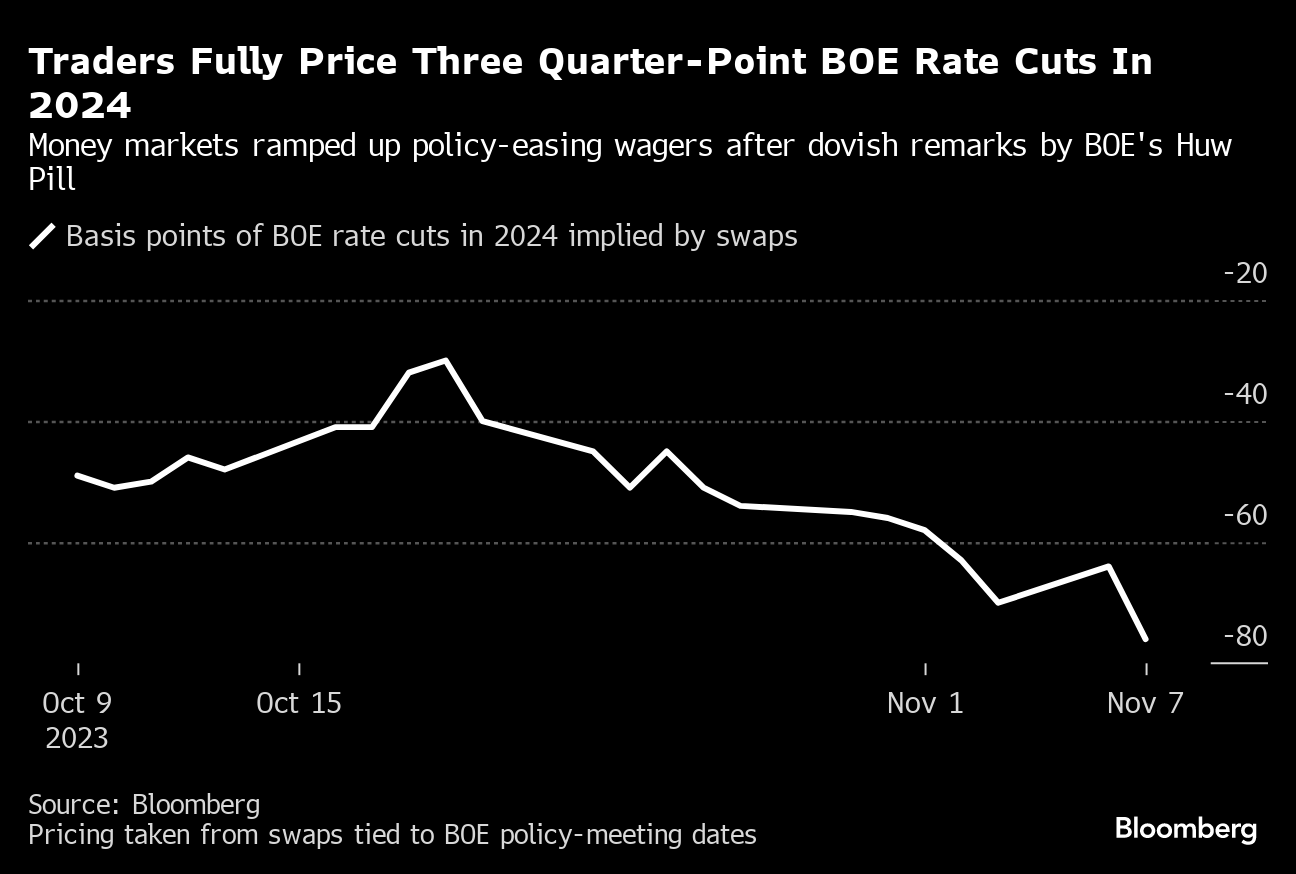 Swaps tied to policy-meeting dates already show a first quarter-point cut by August, something BOE Chief Economist Huw Pill said ‘doesn't seem totally unreasonable.'