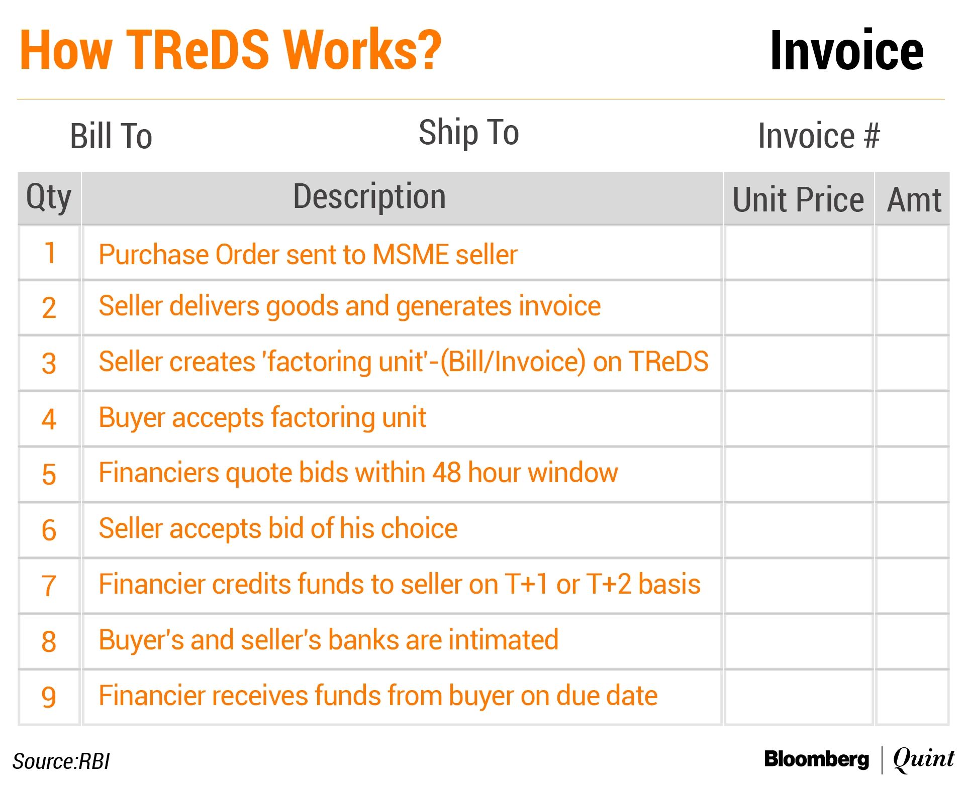 Once the MSME seller delivers goods along with an invoice, they can create a bill or an invoice on the system. The bill or the invoice, called a factoring unit on TReDS, is consequently accepted by the buyer.