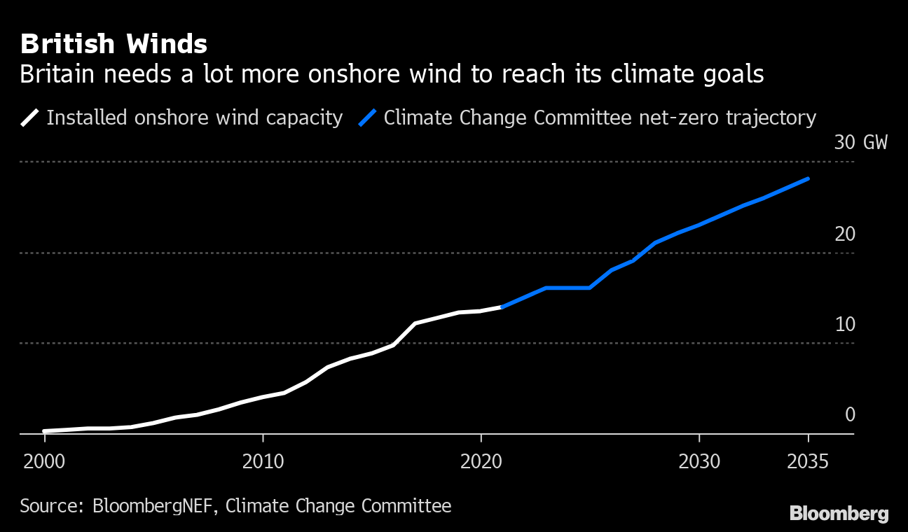Building onshore wind farms is one of the quickest and cheapest ways to add new electricity generation, requiring far less time and equipment than their giant counterparts offshore. They could be critical to meeting the UK's net zero carbon emissions target by 2050, while also helping to wean the country off expensive, imported natural gas that's driving a cost-of-living crisis.