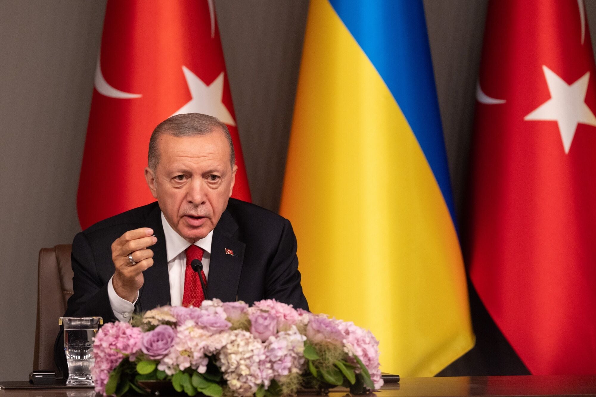 ISTANBUL, TURKEY - JULY 08: Turkish President Recep Tayyip Erdogan speaks to the media during a joint press conference with President of Ukraine, Volodymyr Zelensky on July 08, 2023 in Istanbul, Turkey. President Zelensky in recent days has visited the Cech Republic Slovakia, Bulgaria and Turkey. (Photo by Chris McGrath/Getty Images)