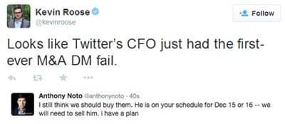 Twitter chief financial officer Anthony Noto on Monday accidentally posted a tweet about a potential acquisition. It seems Mr Noto had intended it as a private or direct message to one of his colleagues at Twitter.