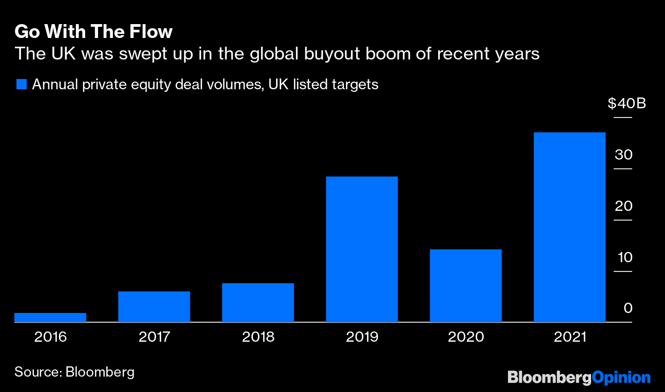 London is an open market for deal-making. Listed firms can't do so-called poison pill defenses with the potential to frustrate bidders (like Twitter did). Where a private equity buyer is dangling a tempting price, the target company is highly unlikely to use the regulatory timetable to kill the transaction.