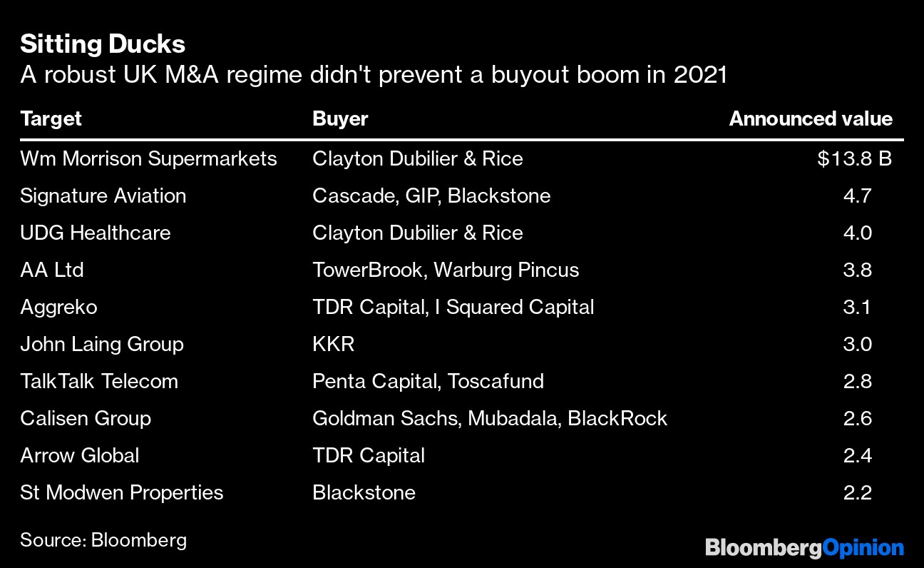 Still, the UK's checks and balances look justified. Last year's deals boom shows that the rules don't hinder takeovers: It culminated in the buyout of grocer Wm Morrison Supermarkets, the UK's largest in the more than a decade.