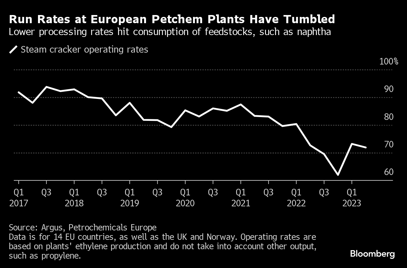 Run rates at petrochemical steam crackers โ€” huge units that convert naphtha and other feedstock into the industry's basic chemical building blocks โ€” have plunged, according to data from Argus Media Ltd. Producer OMV AG on Tuesday also dropped its forecast for European steam cracker utilization.
