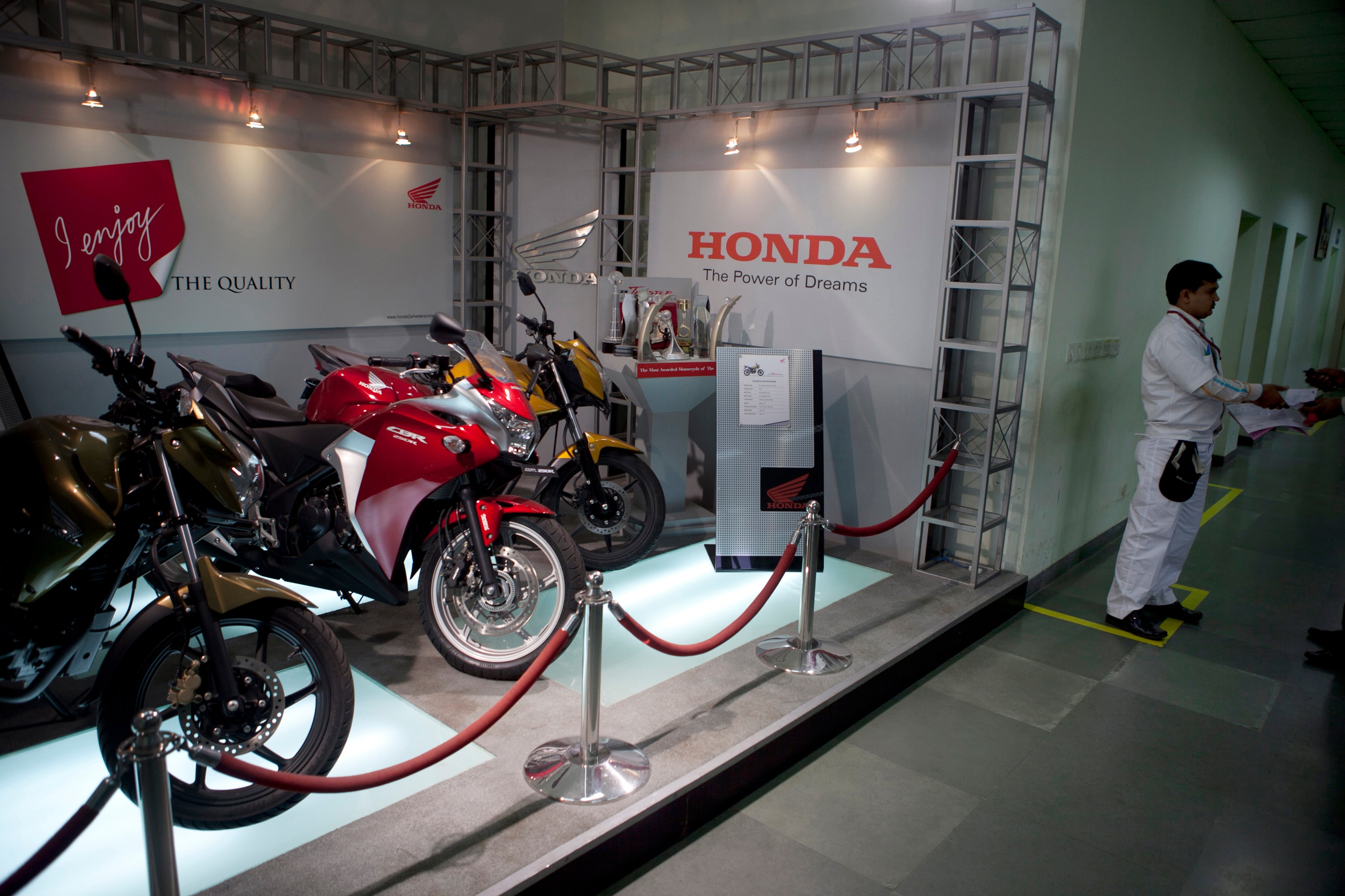 Motorcycles produced by Honda Motorcycle & Scooter India Pvt. are displayed in the reception of the company’s plant in Manesar, India. (Photographer: Prashanth Vishwanathan/Bloomberg)