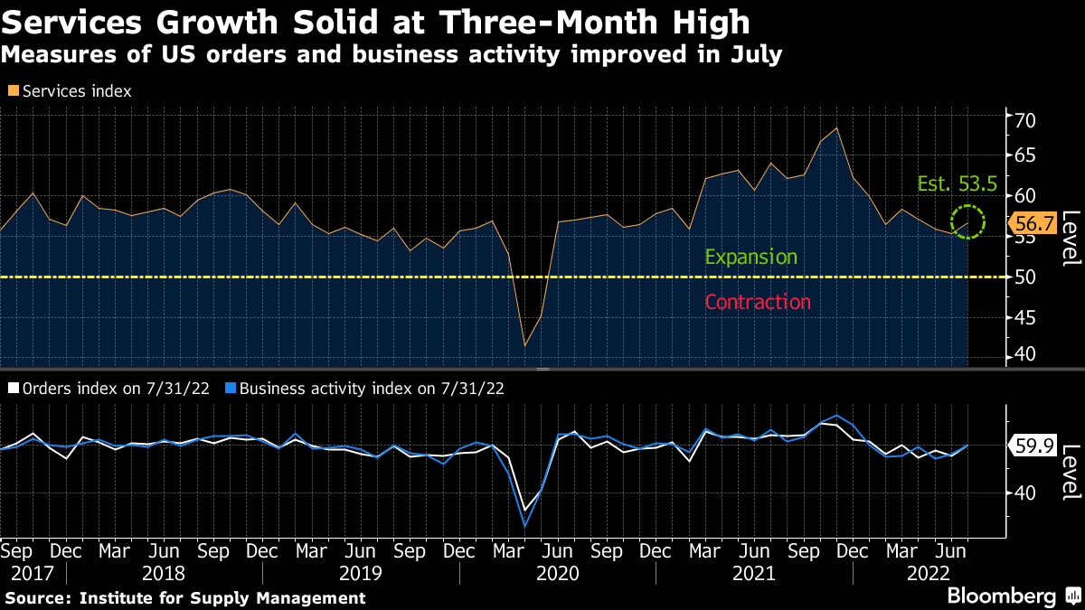 The Institute for Supply Management's index rose to 56.7 from 55.3 a month earlier, data showed Wednesday. Readings above 50 indicate growth and the July result exceeded the most-optimistic forecast in a Bloomberg survey of economists. The median projection was 53.5.