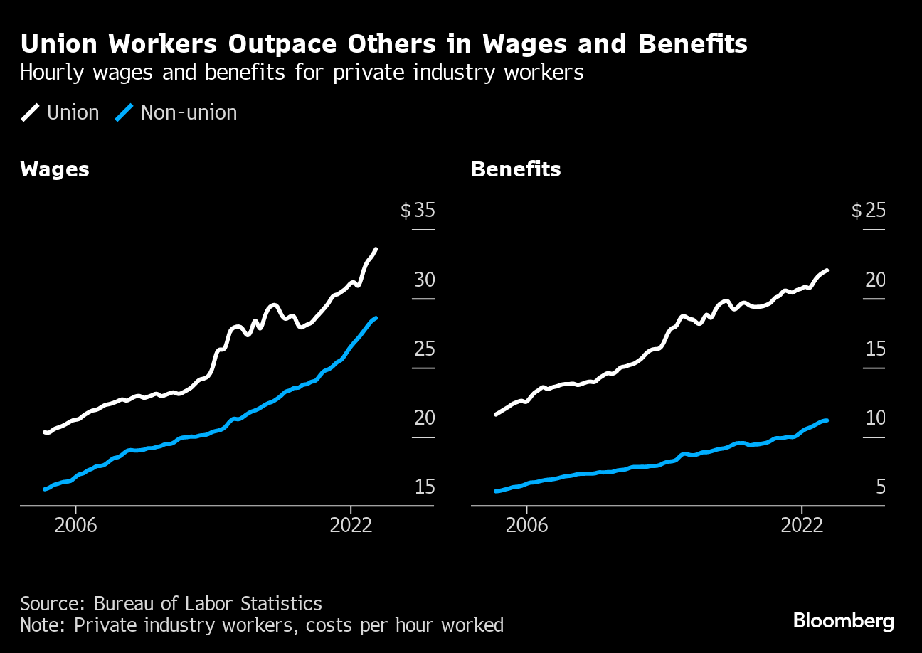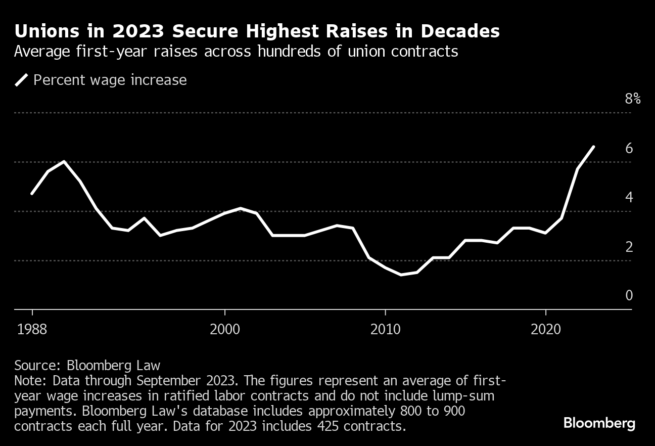 Even before the United Auto Workers reached historic contract deals with carmakers, unions across the country had already won their members 6.6% raises on average in 2023 — the biggest bump in more than three decades, according to an analysis by Bloomberg Law.