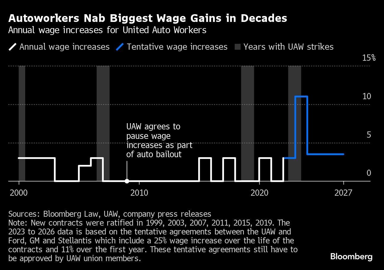 The United Auto Workers scored some of the biggest raises among US workers this year. Tentative deals reached over the last week with Ford Motor Co., General Motors Co. and Stellantis NV include a 25% hourly wage increase over four-plus years, with an 11% bump in the first year, the biggest jump the UAW has seen this century.