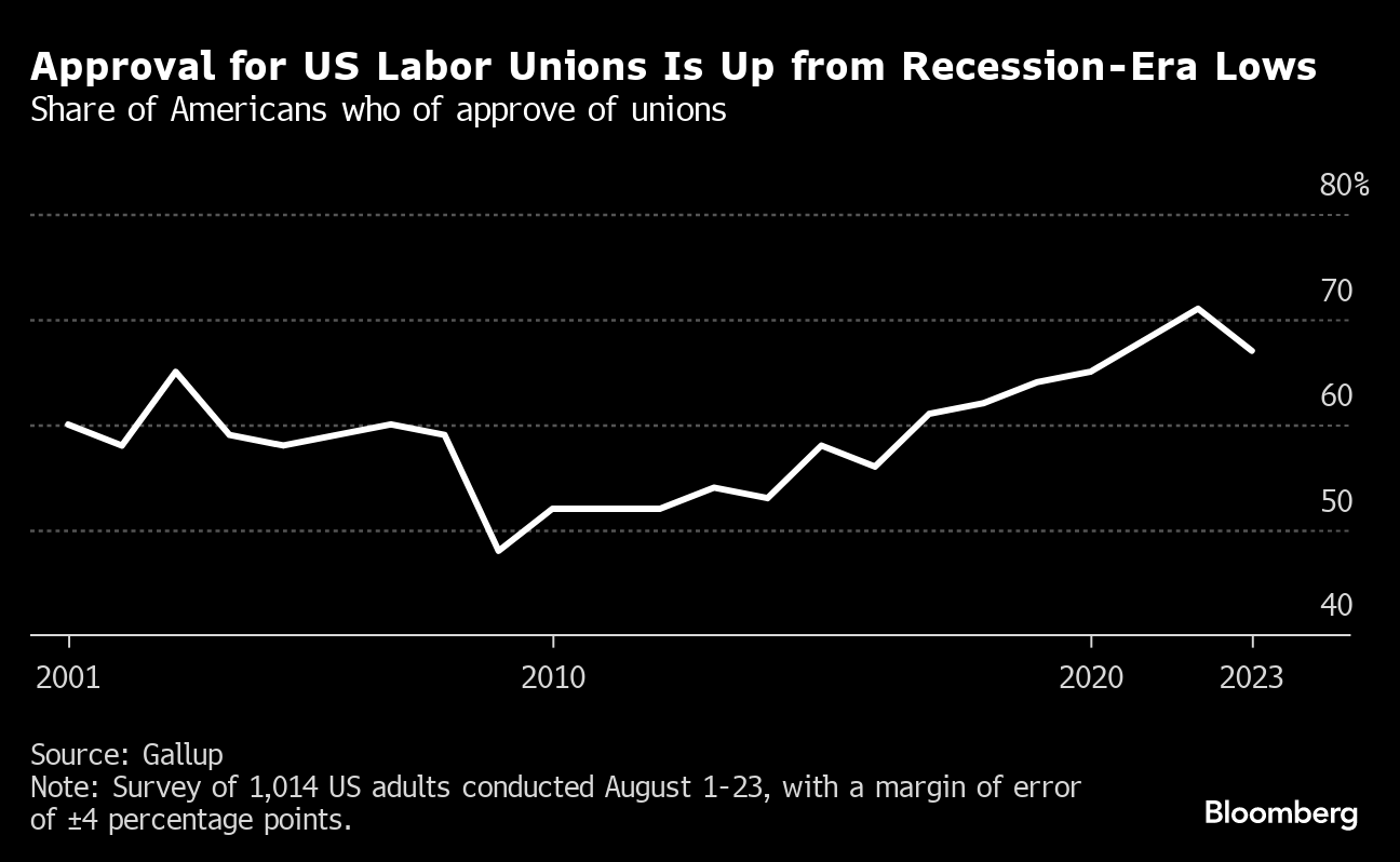Public approval for US unions last year was up to a 57-year high, though has since dipped slightly. Solid majorities of Americans polled by Gallup said they sided with screen writers, actors and auto workers in their disputes.