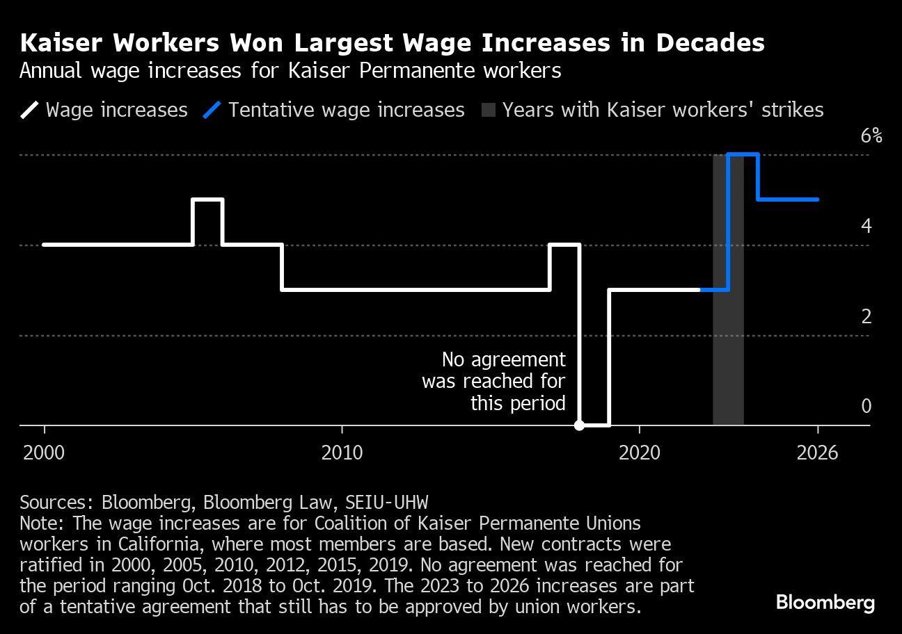 At Kaiser Permanente, health-care workers staged the biggest walkout in the sector ever, with 75,000 joining a three-day strike in early October. The group threatened a longer stoppage if the health system didn't agree to address staffing shortages. Around 10 days later, the union won a deal with pay bumps bigger than anytime in the last two decades.