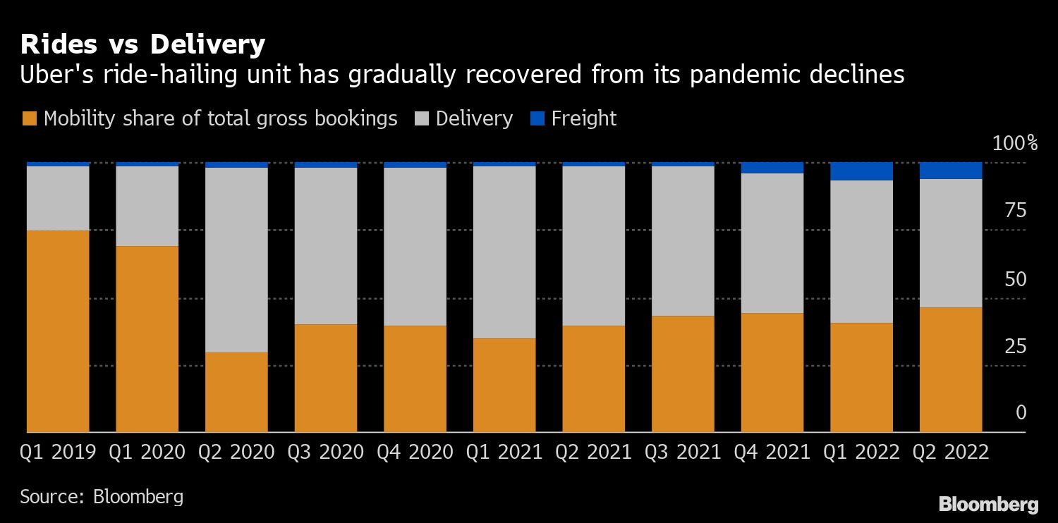 “The business is really hitting on all cylinders,” Chief Executive Officer Dara Khosrowshahi said Tuesday in an interview on Bloomberg Television. He pointed to Uber's record gross bookings and revenue, which more than doubled to $8.1 billion in the second quarter, and said the dual mission in carrying people and making deliveries would set it apart from peers in the event of an economic downturn.