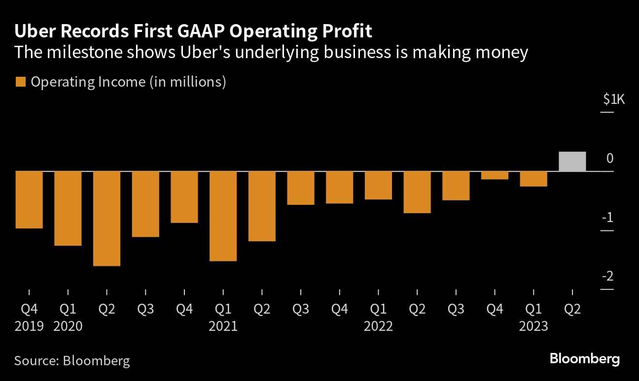 The operating profit, the company's first since its founding in 2009, helped push Uber to a surprising gain in net income in the quarter. Uber has previously reported a quarterly net profit on occasion but it has always been fueled largely from investment gains, as it was again in the second quarter. In the three months ended June 30, Uber generated net income of $394 million, far surpassing the loss of $49.2 million analysts were expecting.