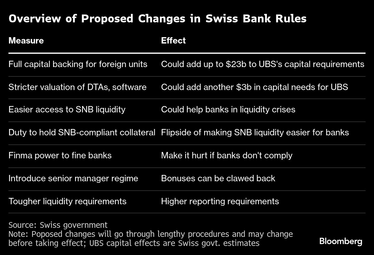 The biggest hit is set to come from a proposal that would require UBS to increase the capital held at home against its stakes in foreign units to 100% from 60% at present, according to a long-awaited outline for legislation released Friday. The government estimates that this will force UBS to add as much as $23 billion in capital to its Swiss-based main unit.