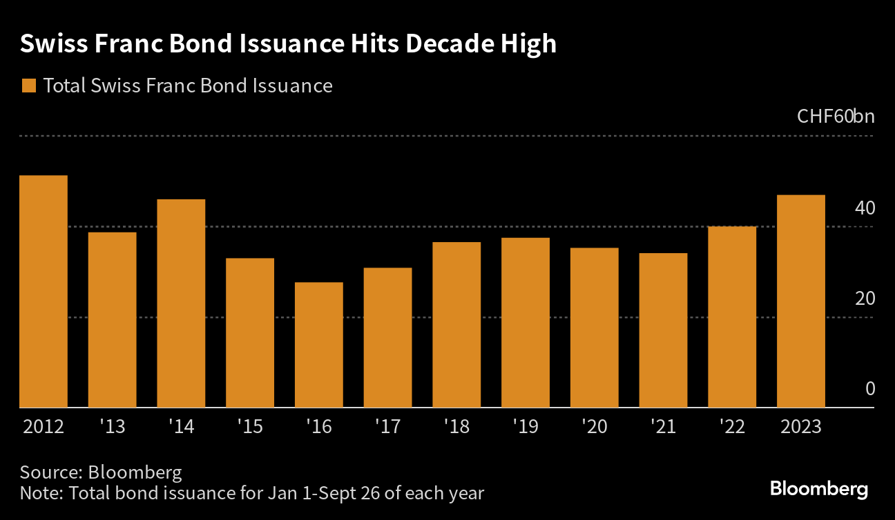And this has been a particularly good year to gain business in the space, with Swiss borrowing costs significantly lower than in the euro area and the franc the top performer among Group-of-10 currencies. There have been 46.8 billion Swiss francs ($50.8 billion) of debt sales so far, the most in more than a decade.